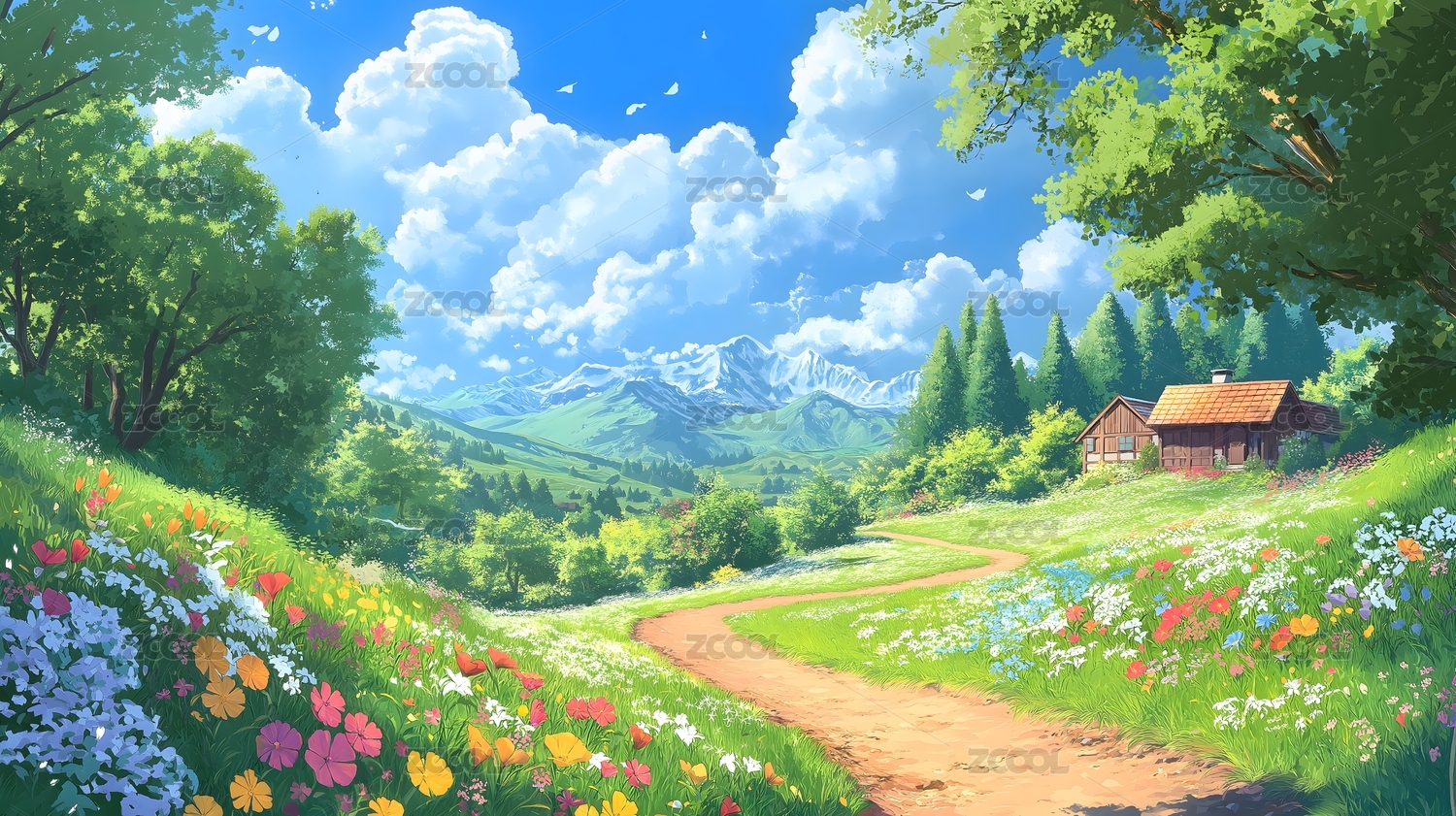 夏天户外旅行山峰房屋乡村风景蓝天白云插画