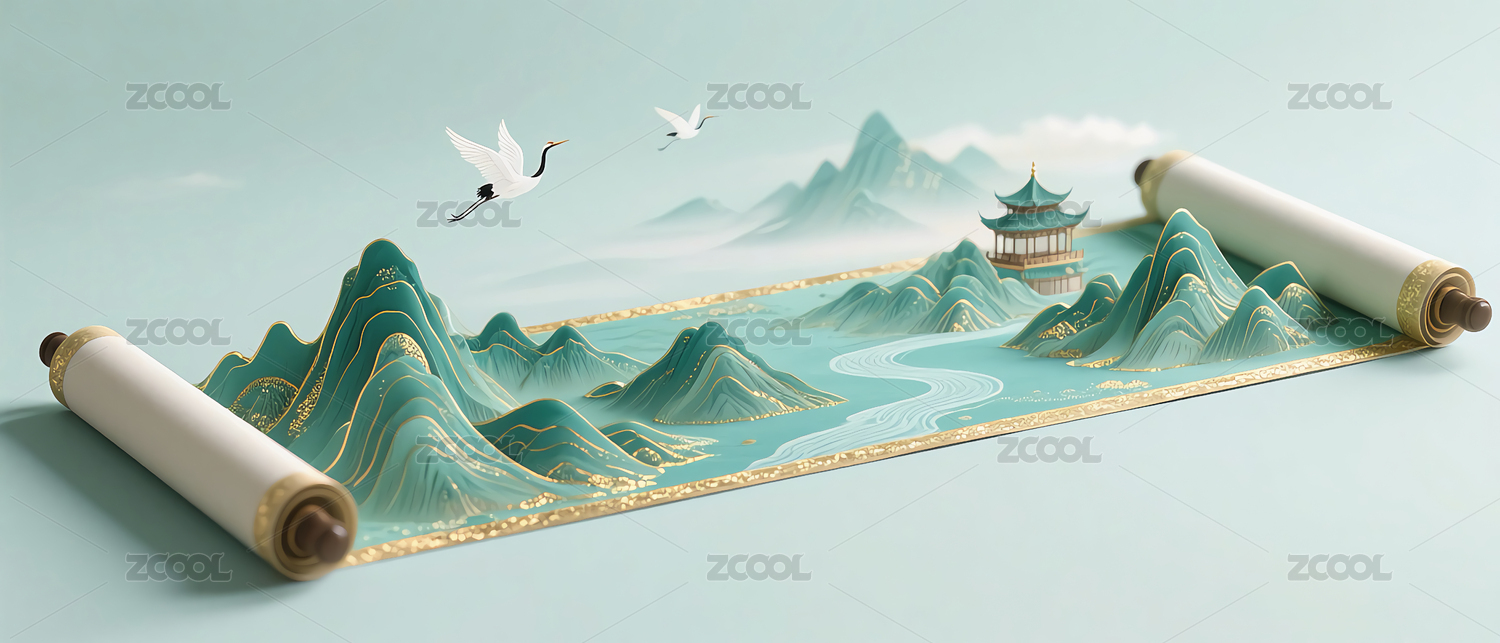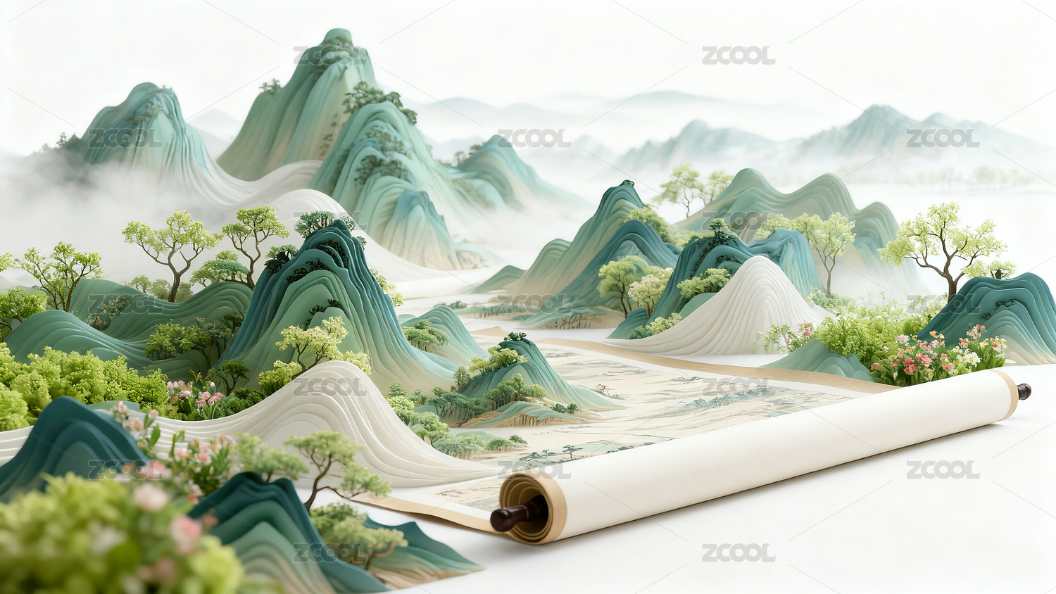山水,国风,水墨,意境,云雾,山峦,新中式,卷轴,诗意,唯美