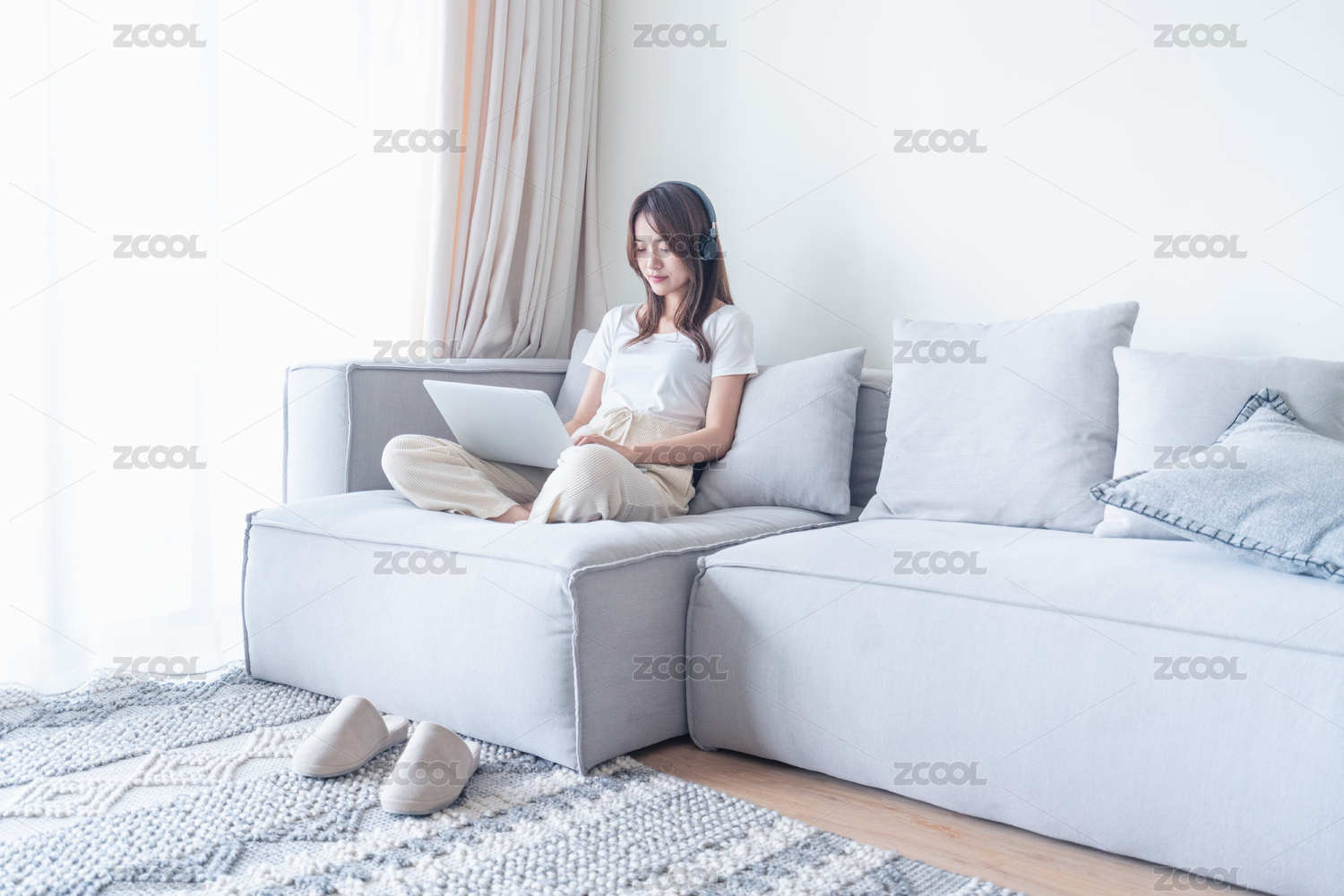 在客厅沙发上用耳机听音乐使用笔记本电脑的女生