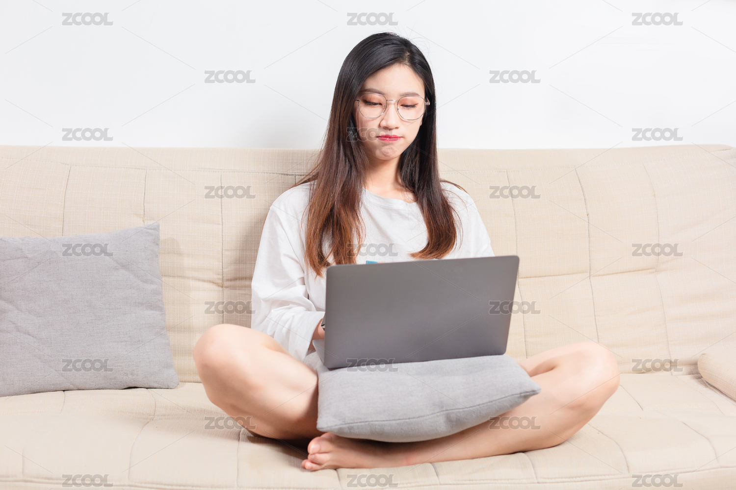 坐在沙发上的美女,边用电脑边哭泣
