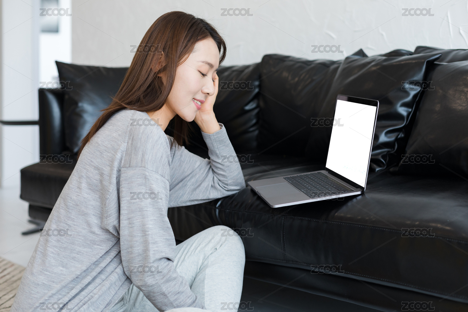 坐在沙发上的亚洲美女,正在使用电脑