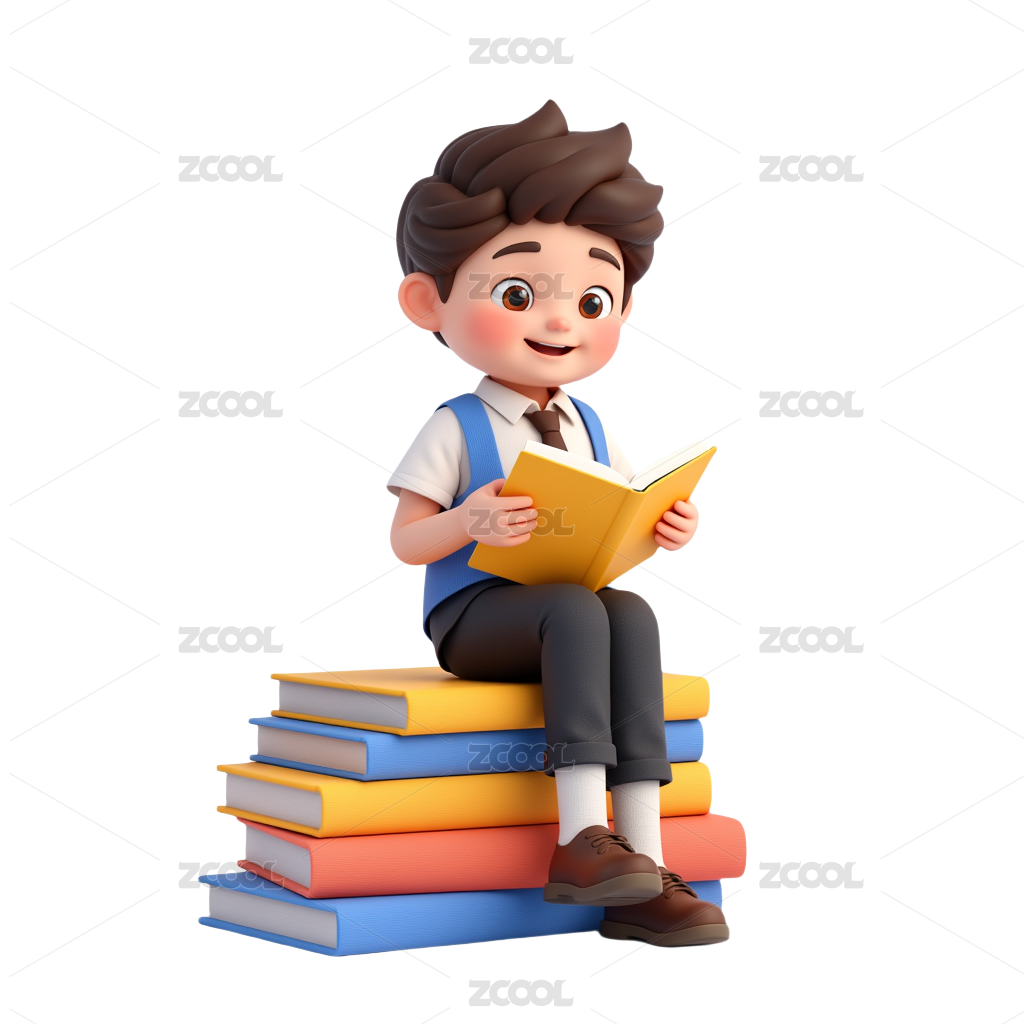 白底3D卡通风格坐在书本上微笑看书的儿童