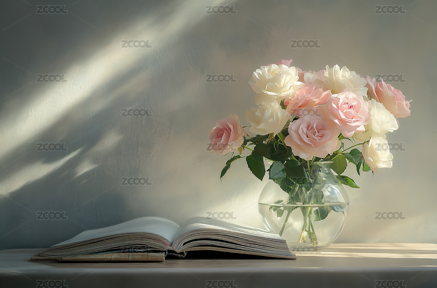 木桌玫瑰插花与翻开书本营造文艺氛围