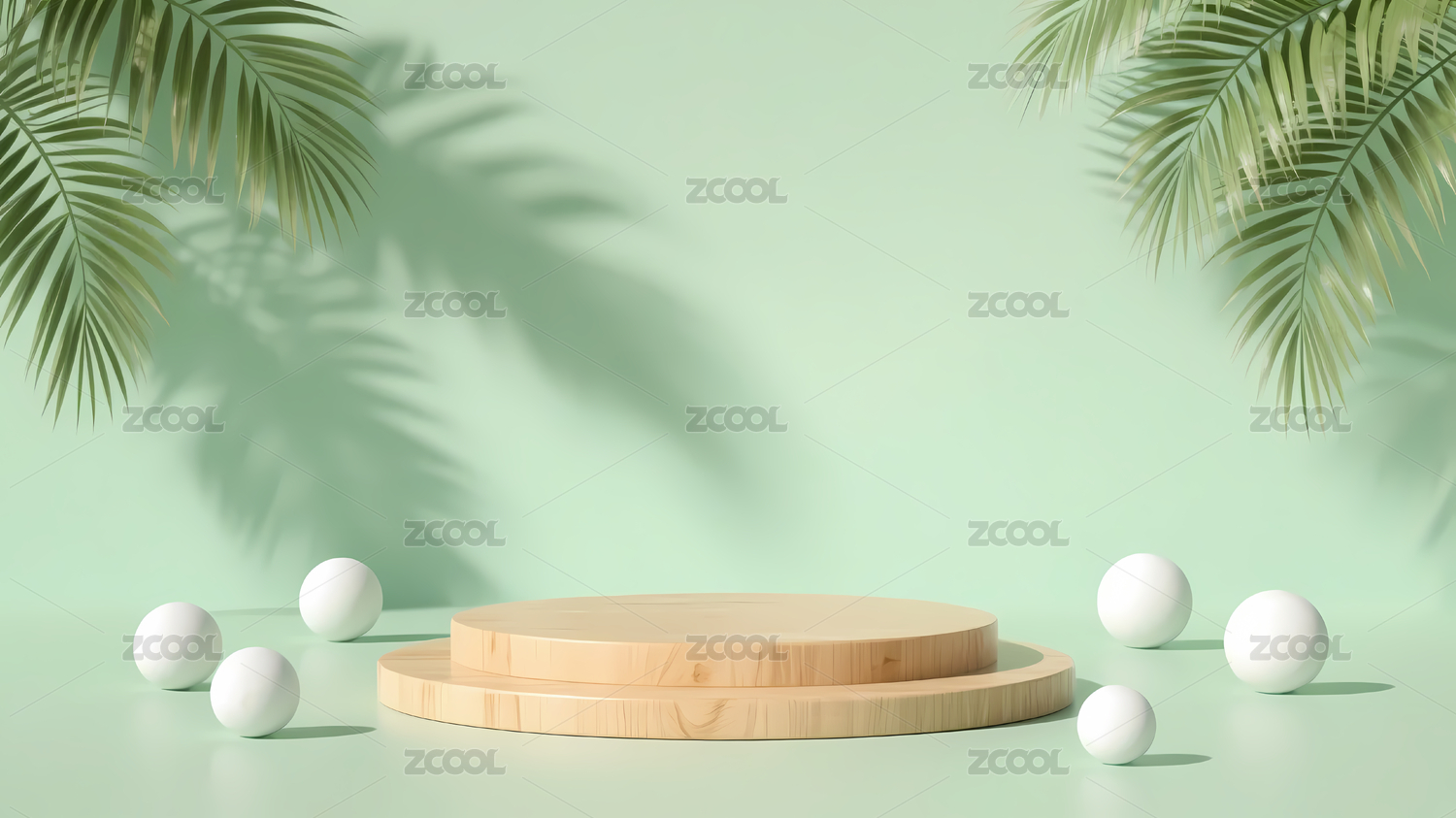 木质圆形讲台与棕榈叶