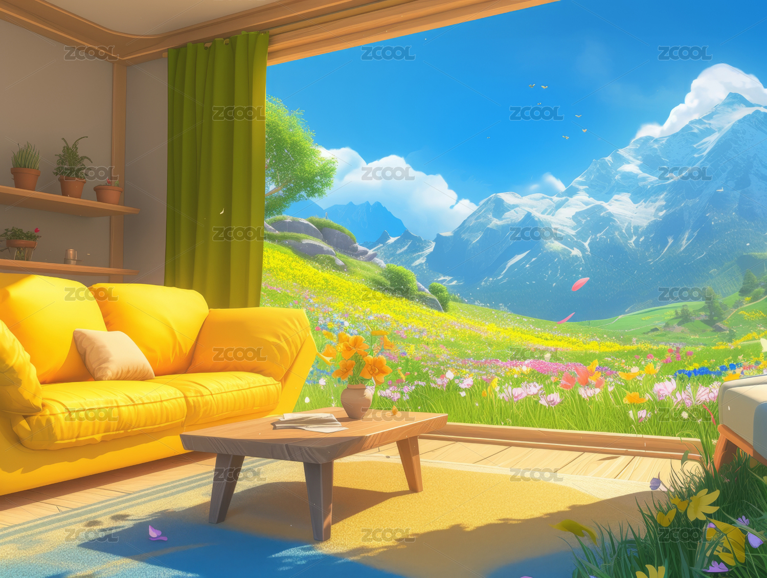 客厅,田园,花朵,小路,阳光,沙发,茶几,书籍,花瓶