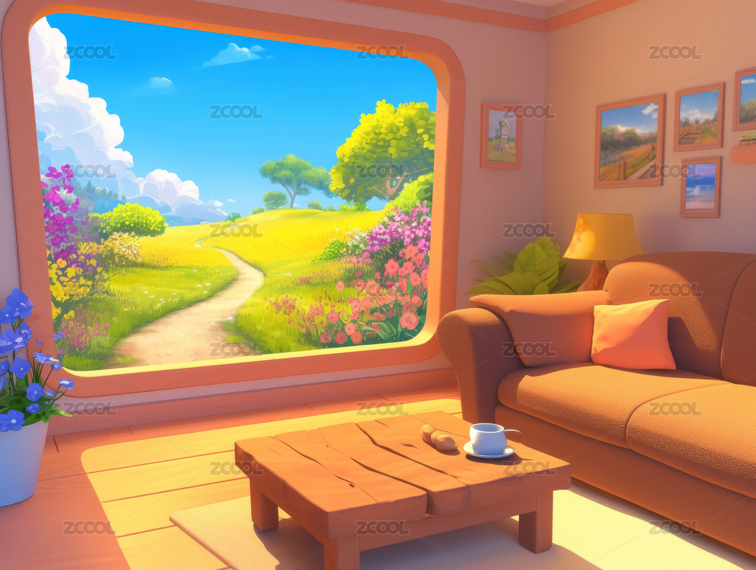温馨客厅与窗外花海