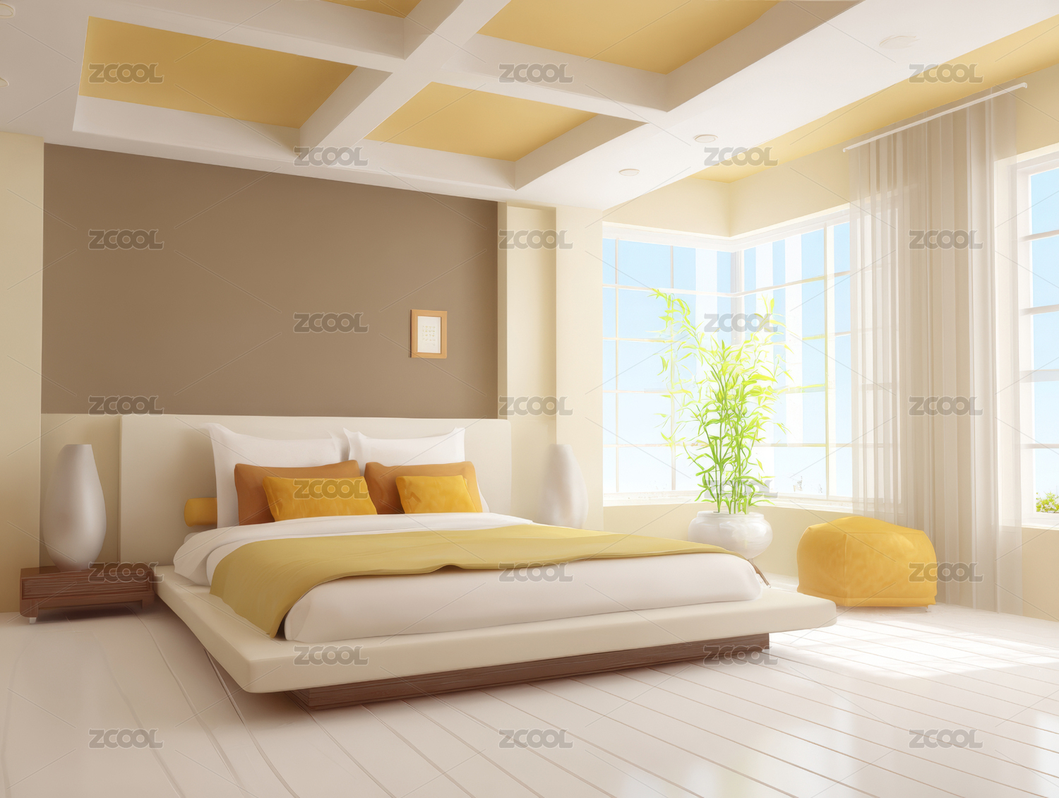 卧室,现代,简约,橙色,床,窗户,植物,装饰画,地毯