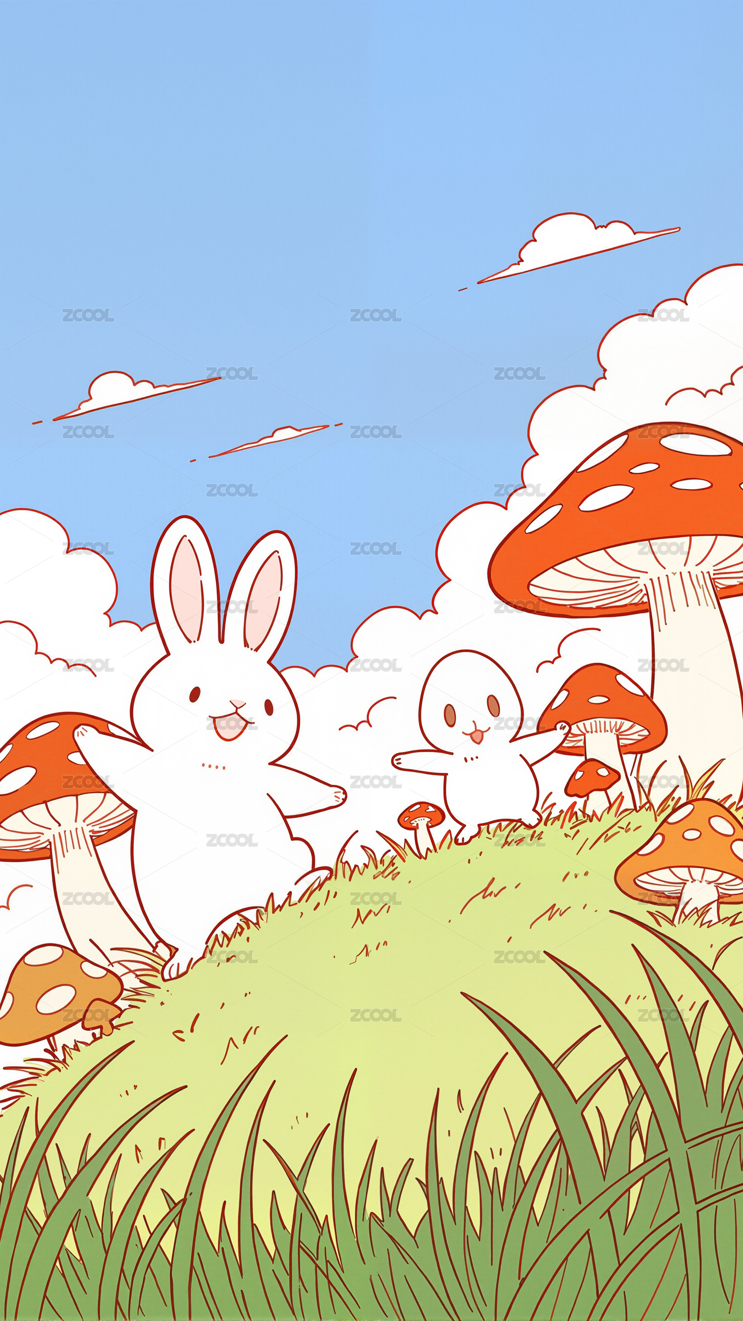 草地上的白兔与蘑菇