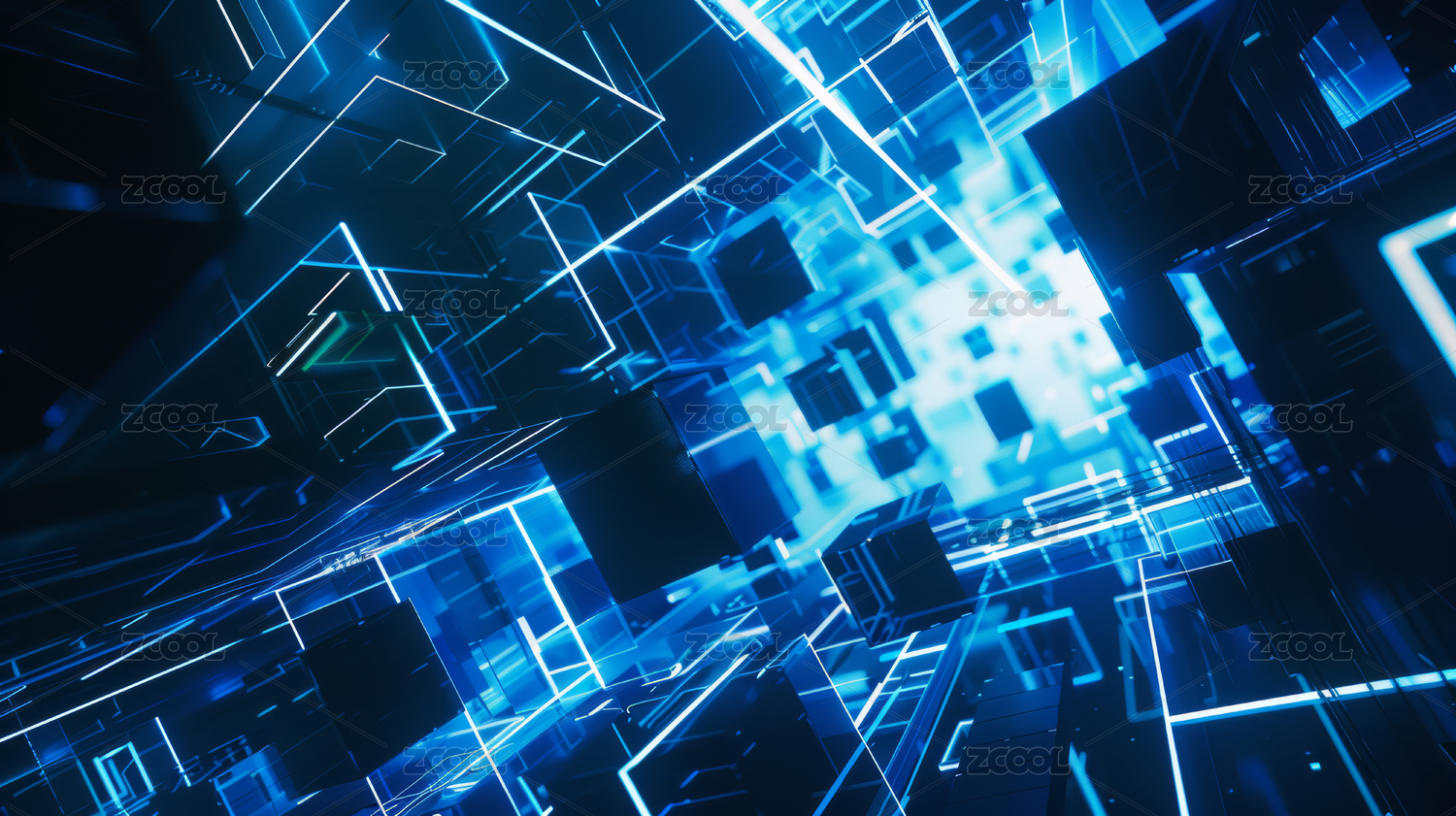 蓝色发光立方体构成的抽象空间