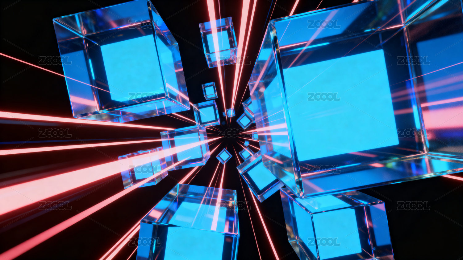 蓝色透明立方体与红色光线交织的科技感画面