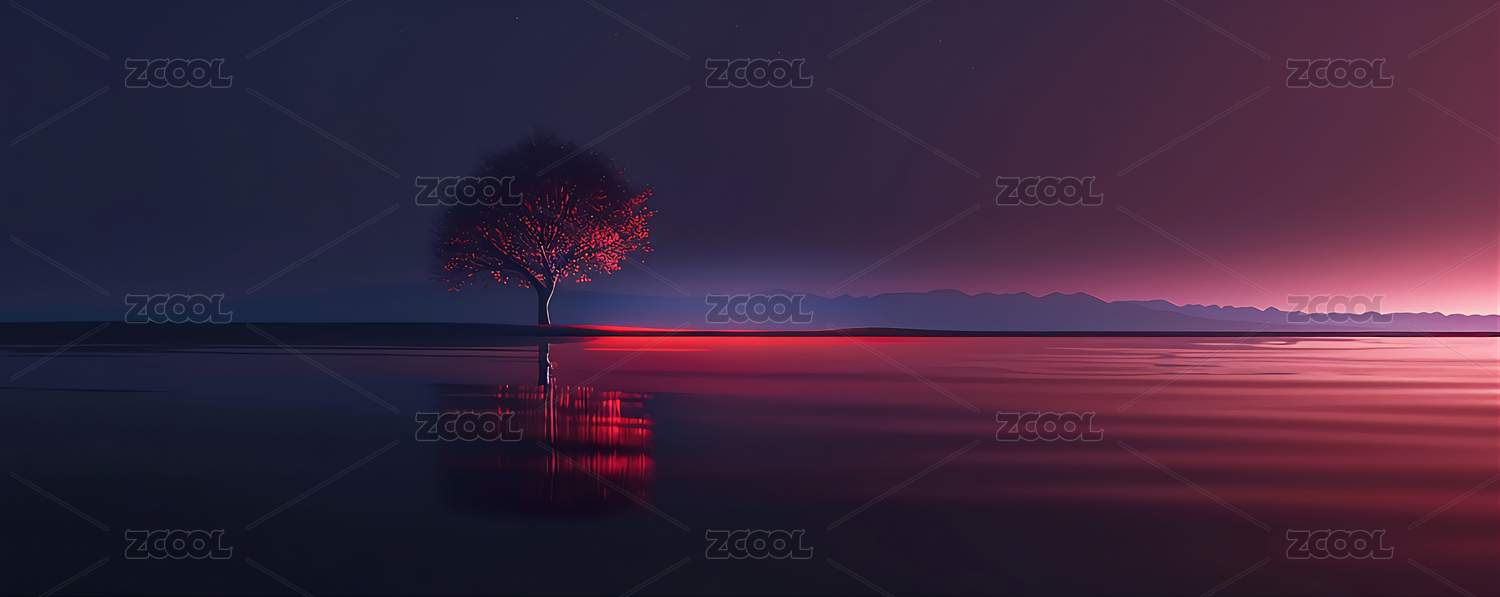 湖畔孤树夕阳