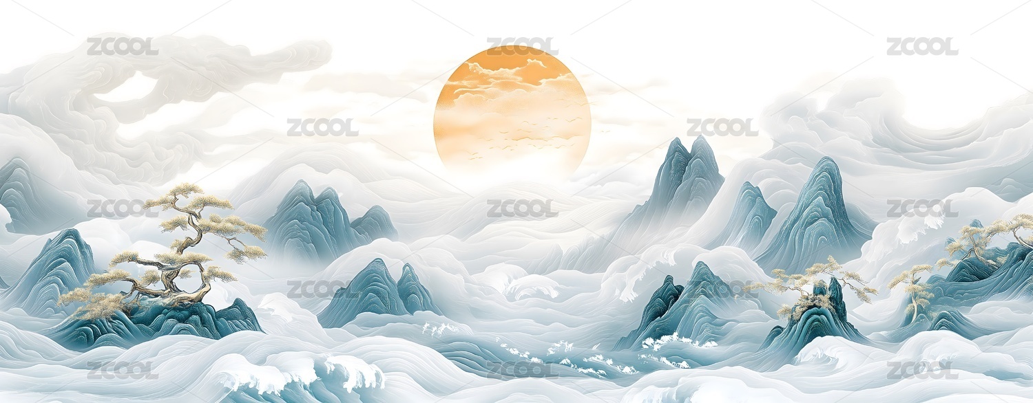 中国传统浅蓝色山水古风国风水墨画背景壁纸