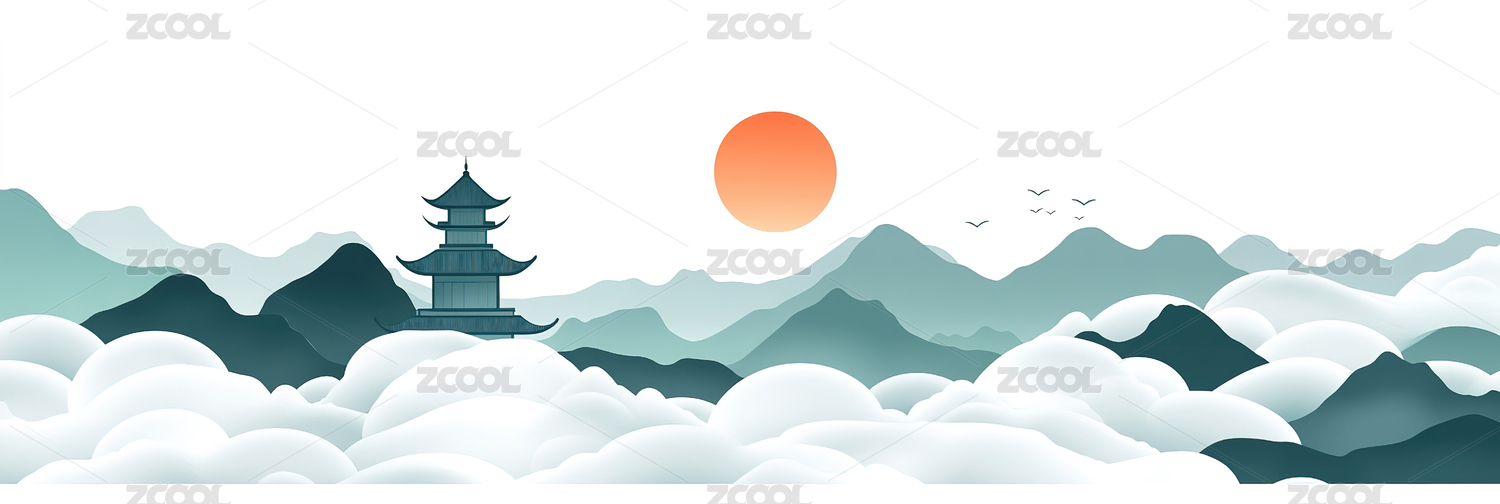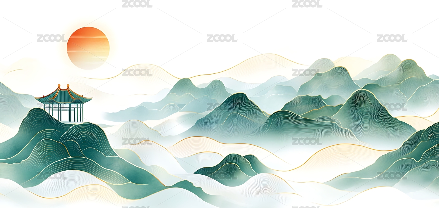 背景,云雾,古建,亭台,楼阁,中国风,山水画,青绿,写意,意境