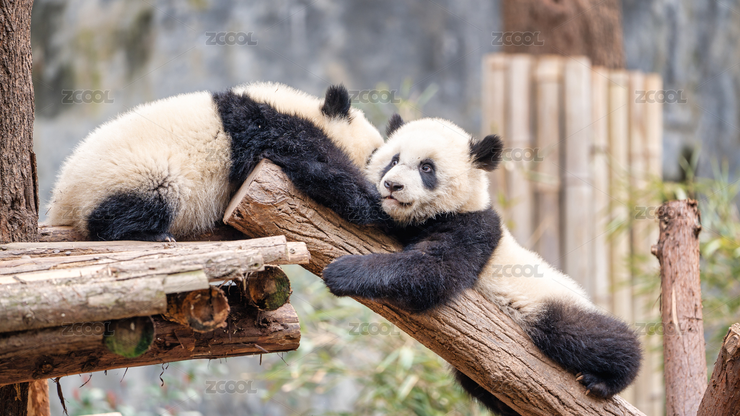 成都大熊猫繁育研究基地两只大熊猫幼崽玩耍