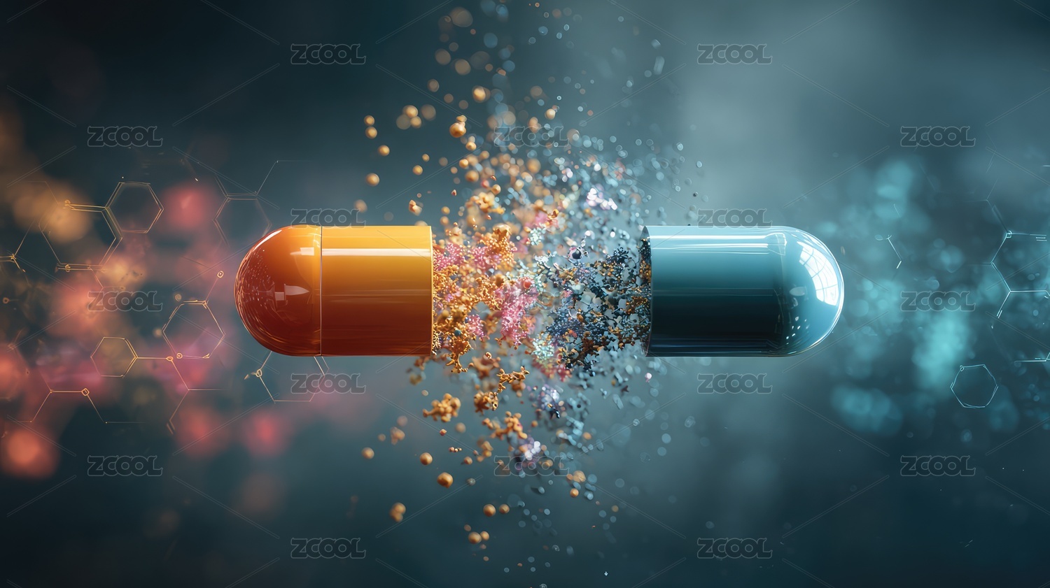 爆炸的黄蓝色药丸胶囊与彩色元素