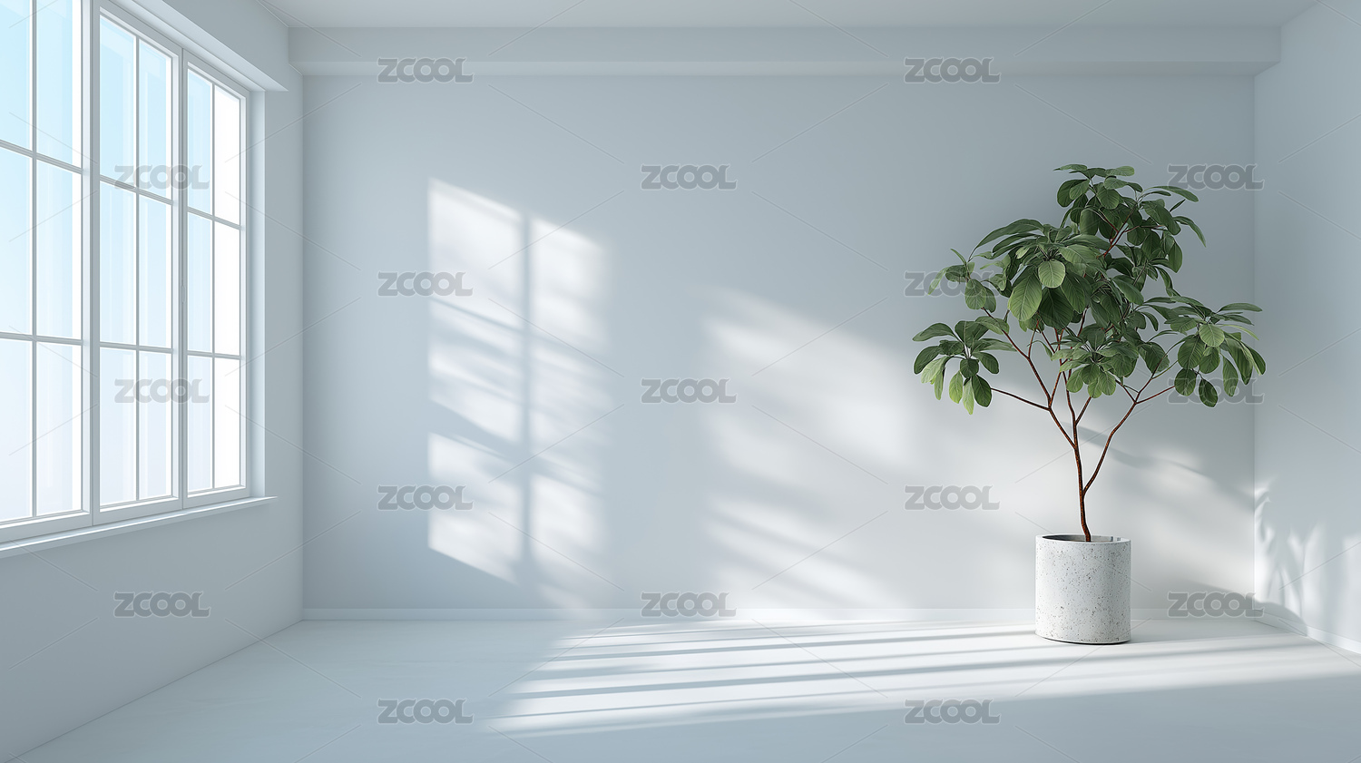 简约空房间双窗绿植投下光影