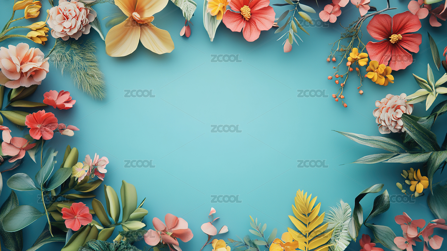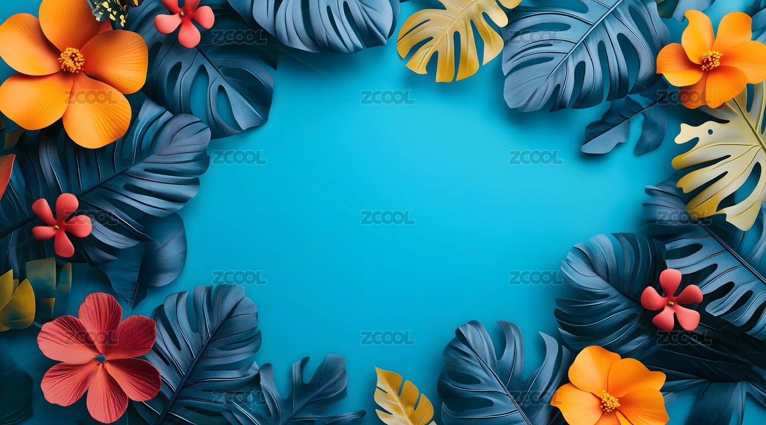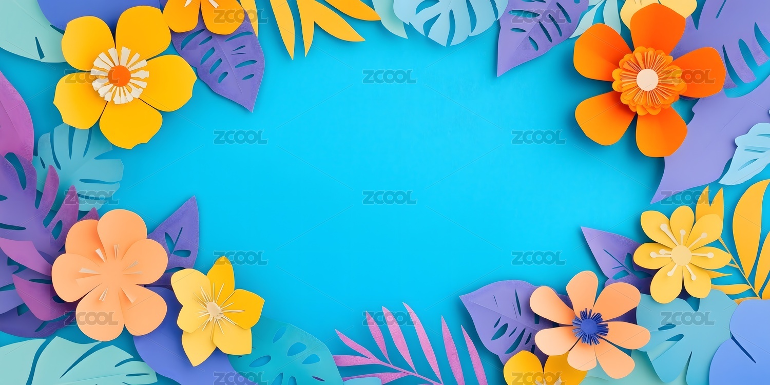 3D蓝色剪纸风格花朵叶子装饰插画背景
