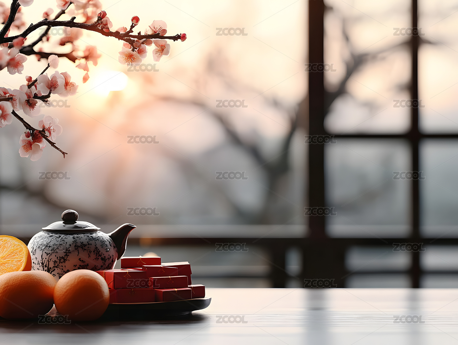 窗前茶香远山朦胧
