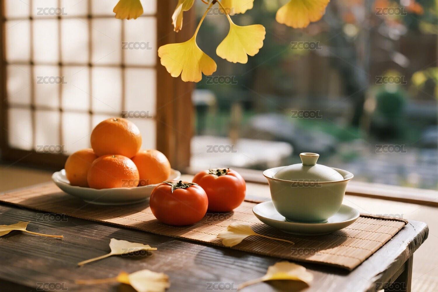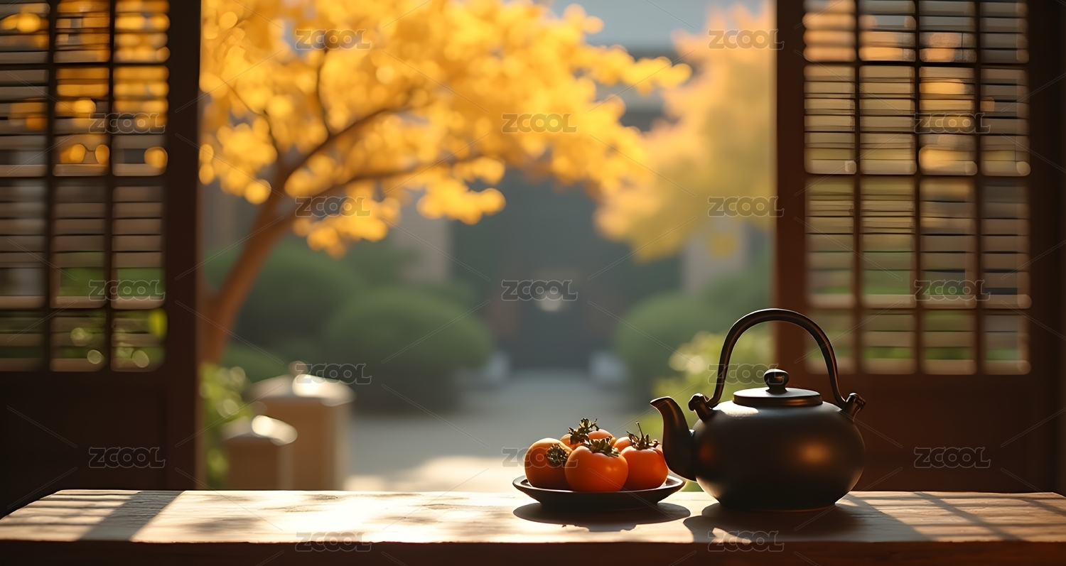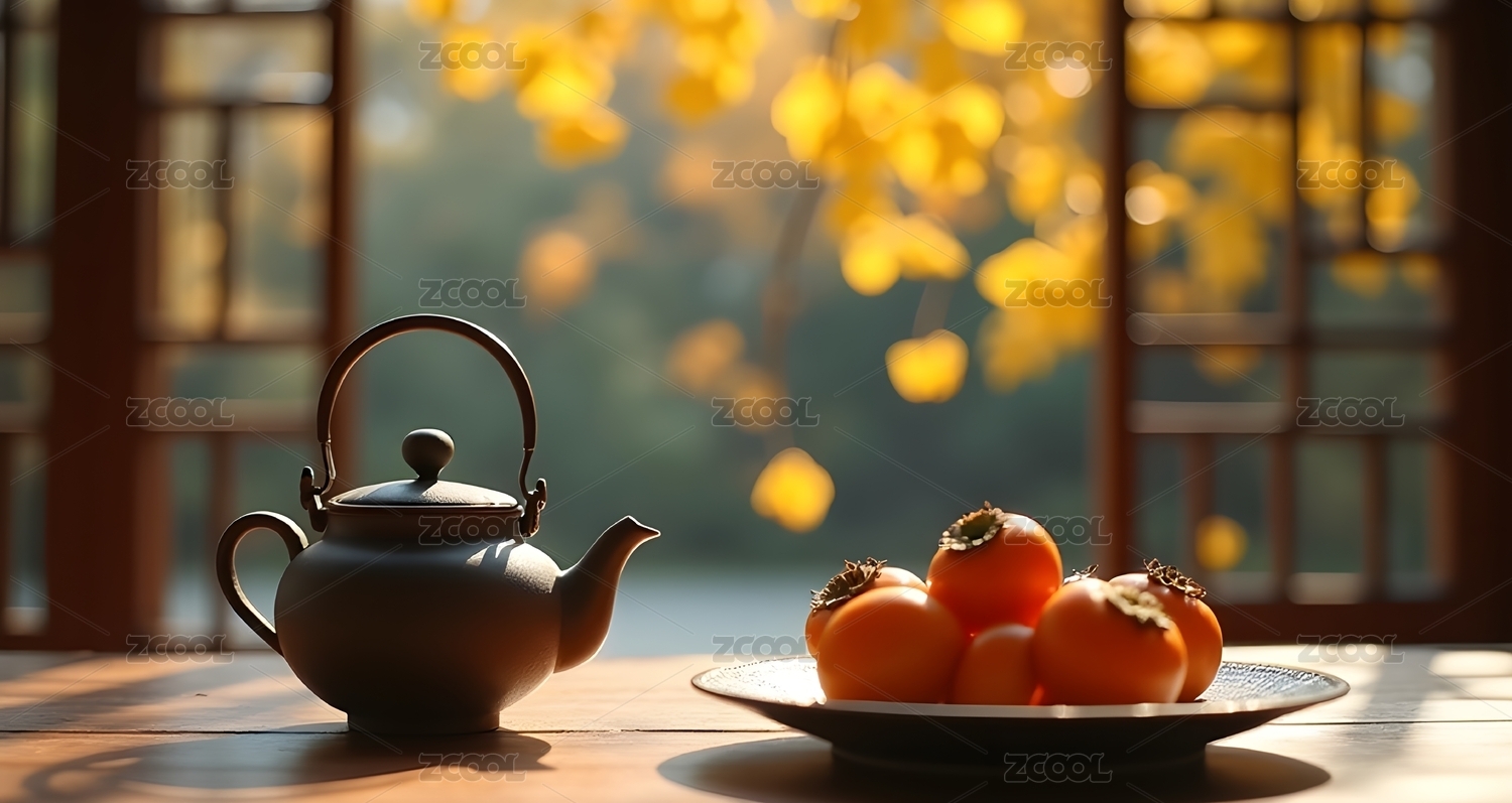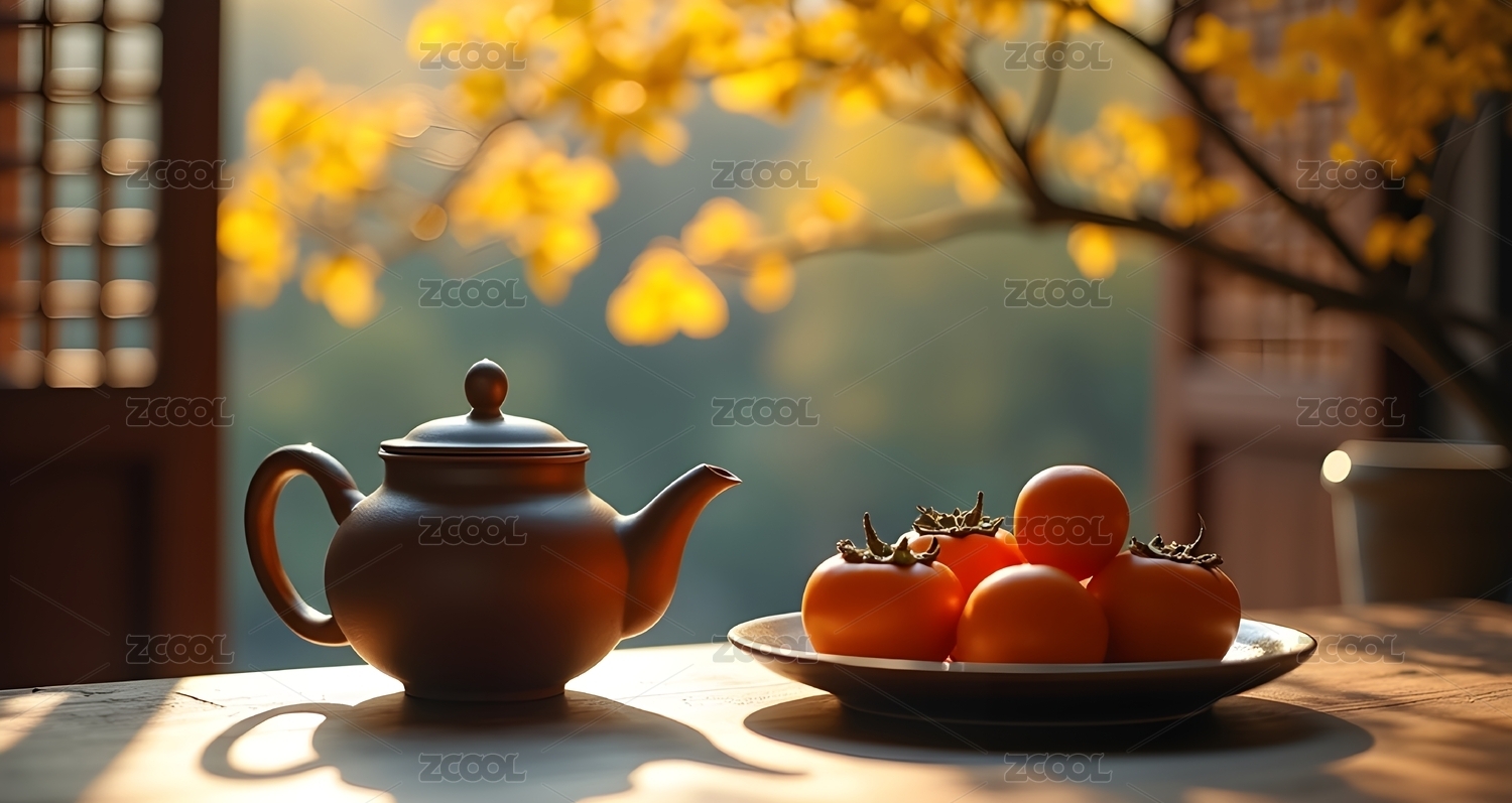 秋日桌前的茶果景致