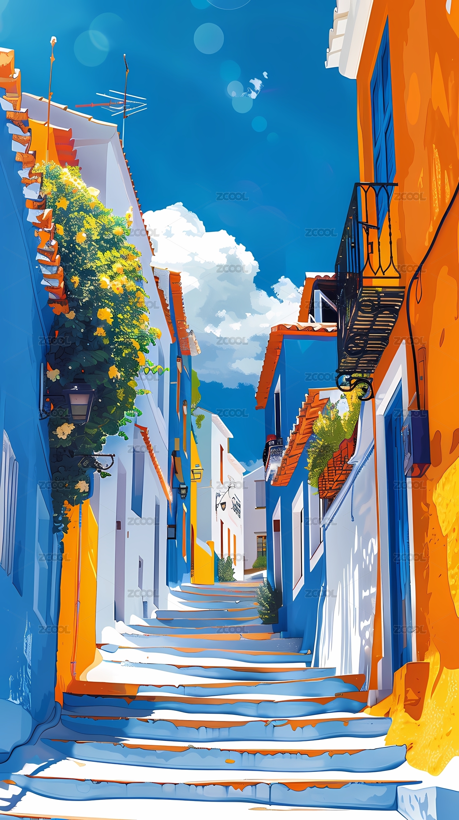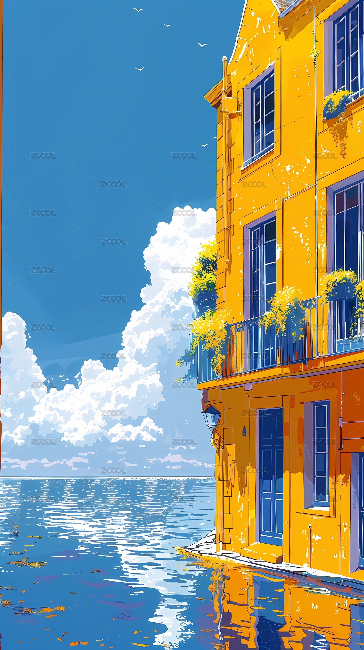 白色,蓝色,花,花盆,树,海,天空,阳光,插图,海报