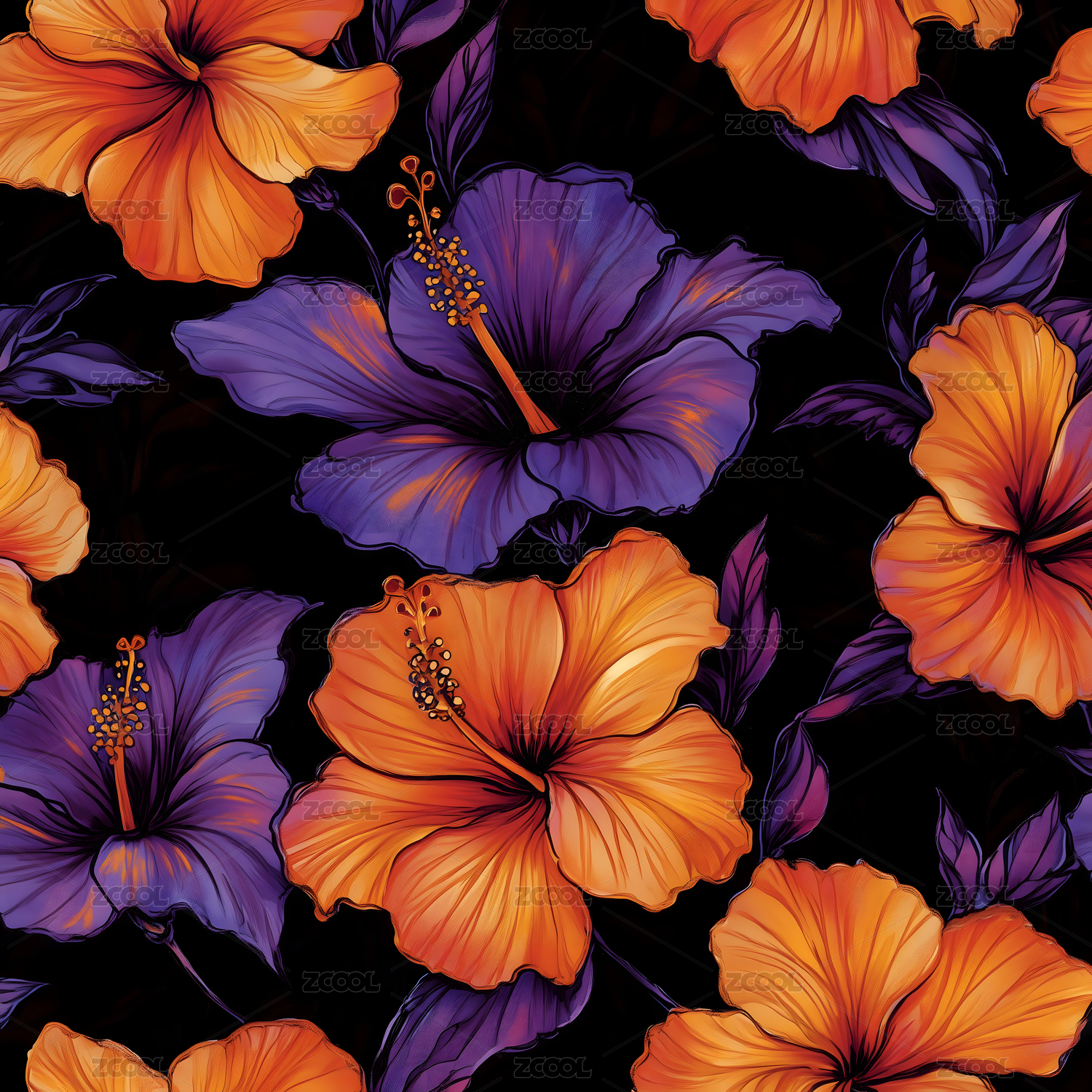 红色背景热带花卉图案。郁郁葱葱的叶子花卉