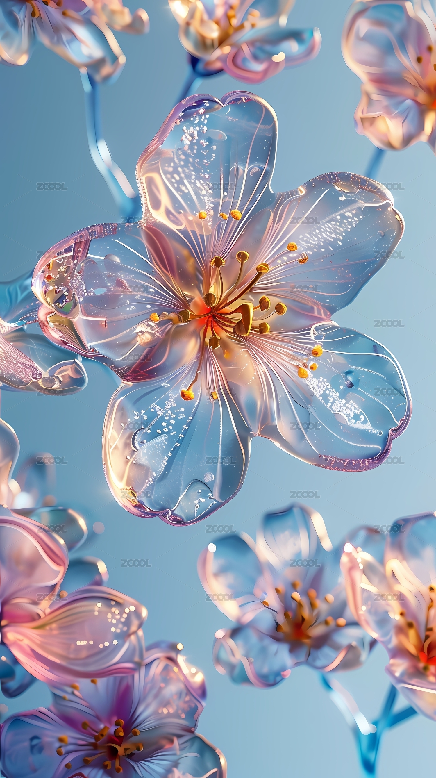 清新明亮水面漂浮晶莹透明花朵3D立体插画