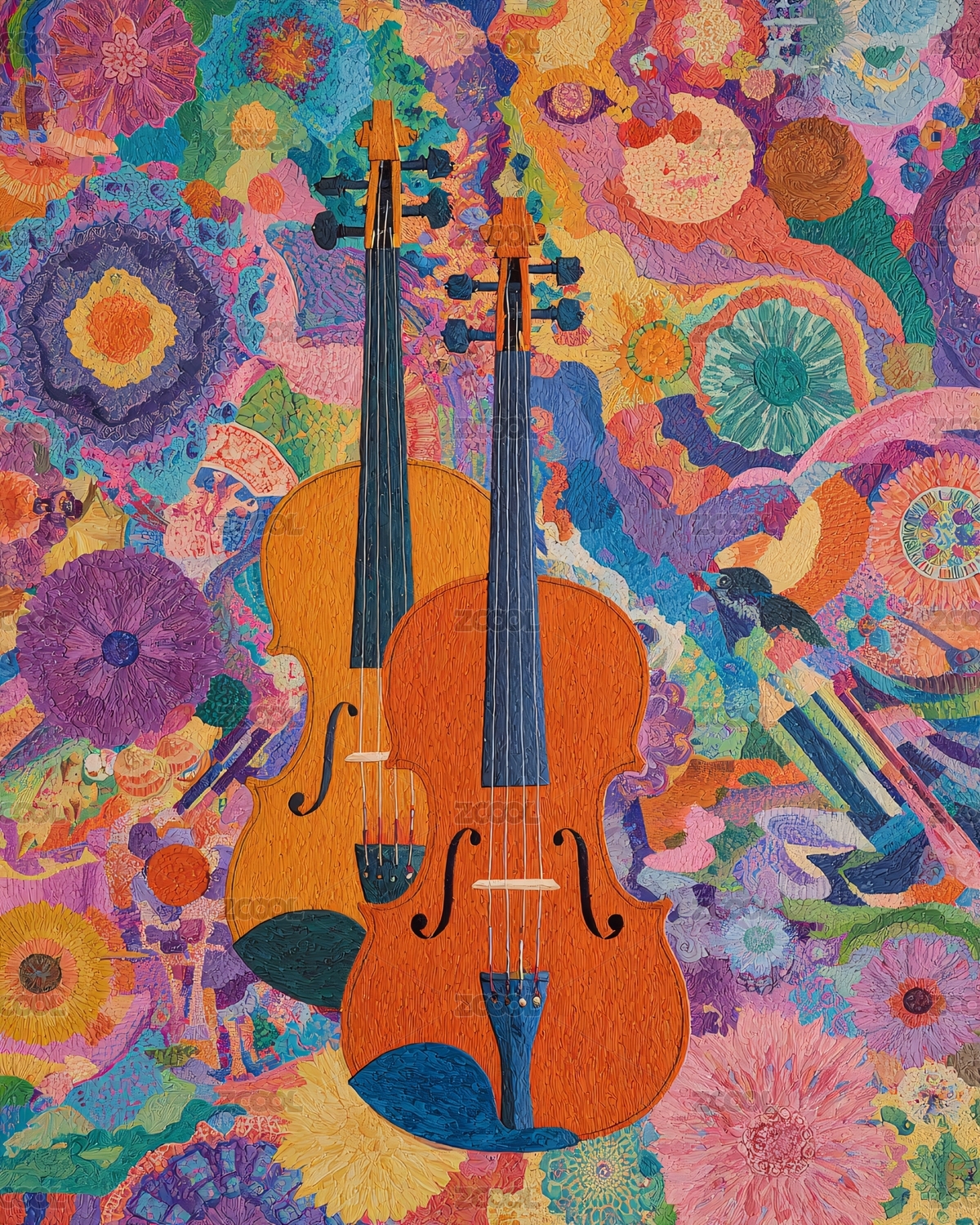 这四张图片均采用了抽象艺术风格来表现不同的音乐乐器,包括小提琴、钢琴、鼓组和大提琴。每张图片都使用了鲜艳的色彩和简洁的线条,形成了强烈的视觉冲击力和现代感。