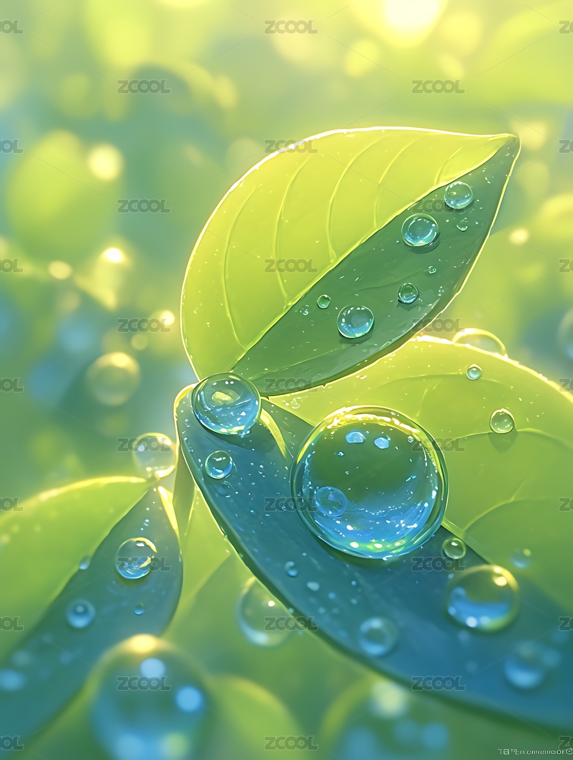 嫩绿叶片上闪烁的七彩露珠