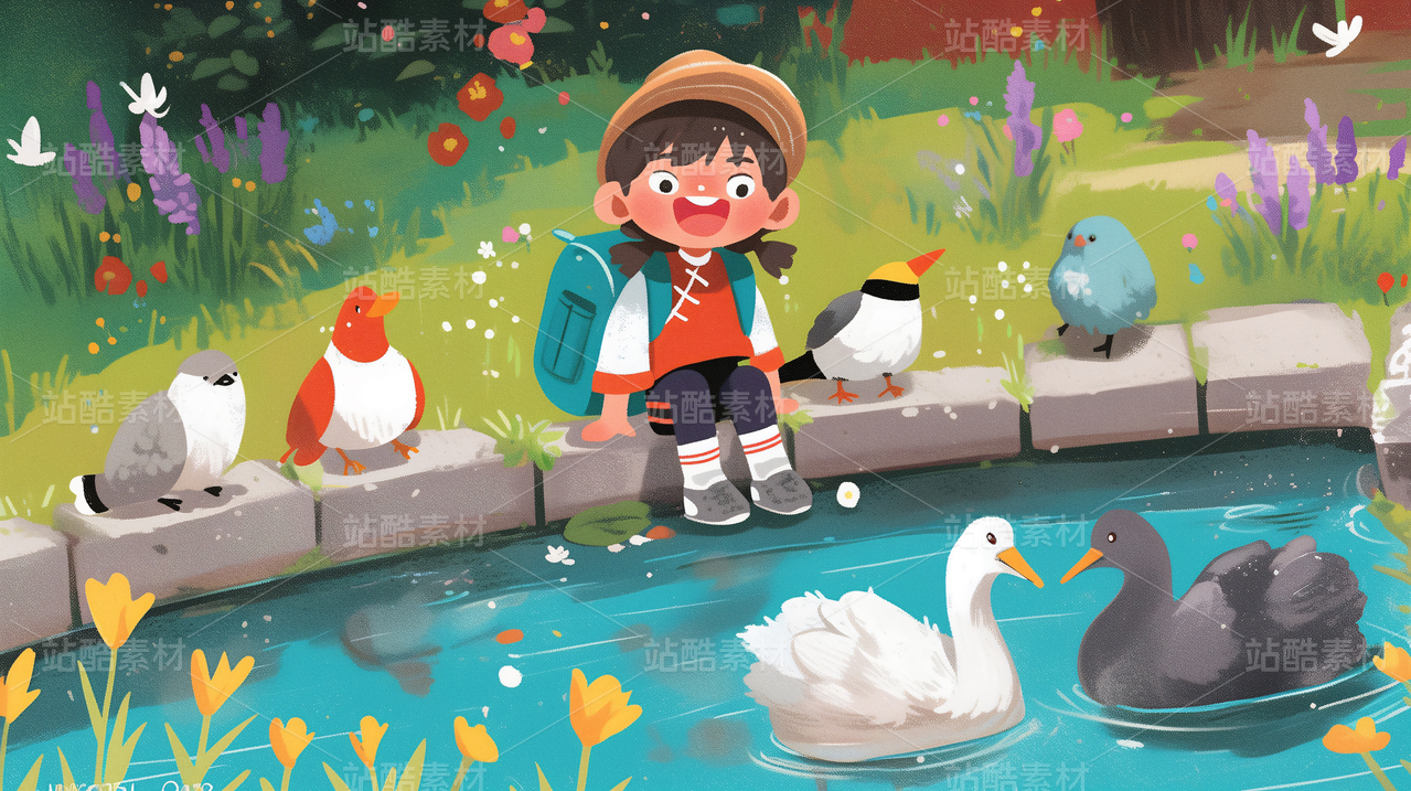 一个女孩坐在池塘边看天鹅