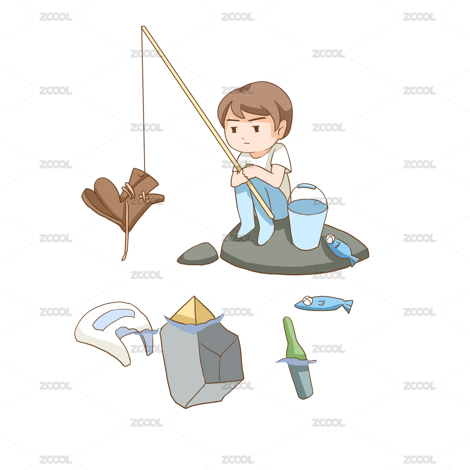 卡通爱好钓鱼的男孩