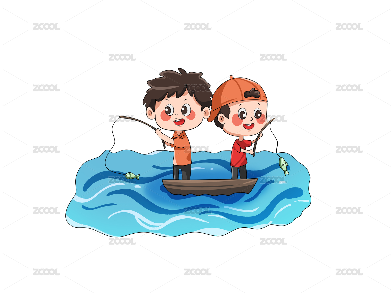 两小孩坐在小船上垂钓卡通漫画元素
