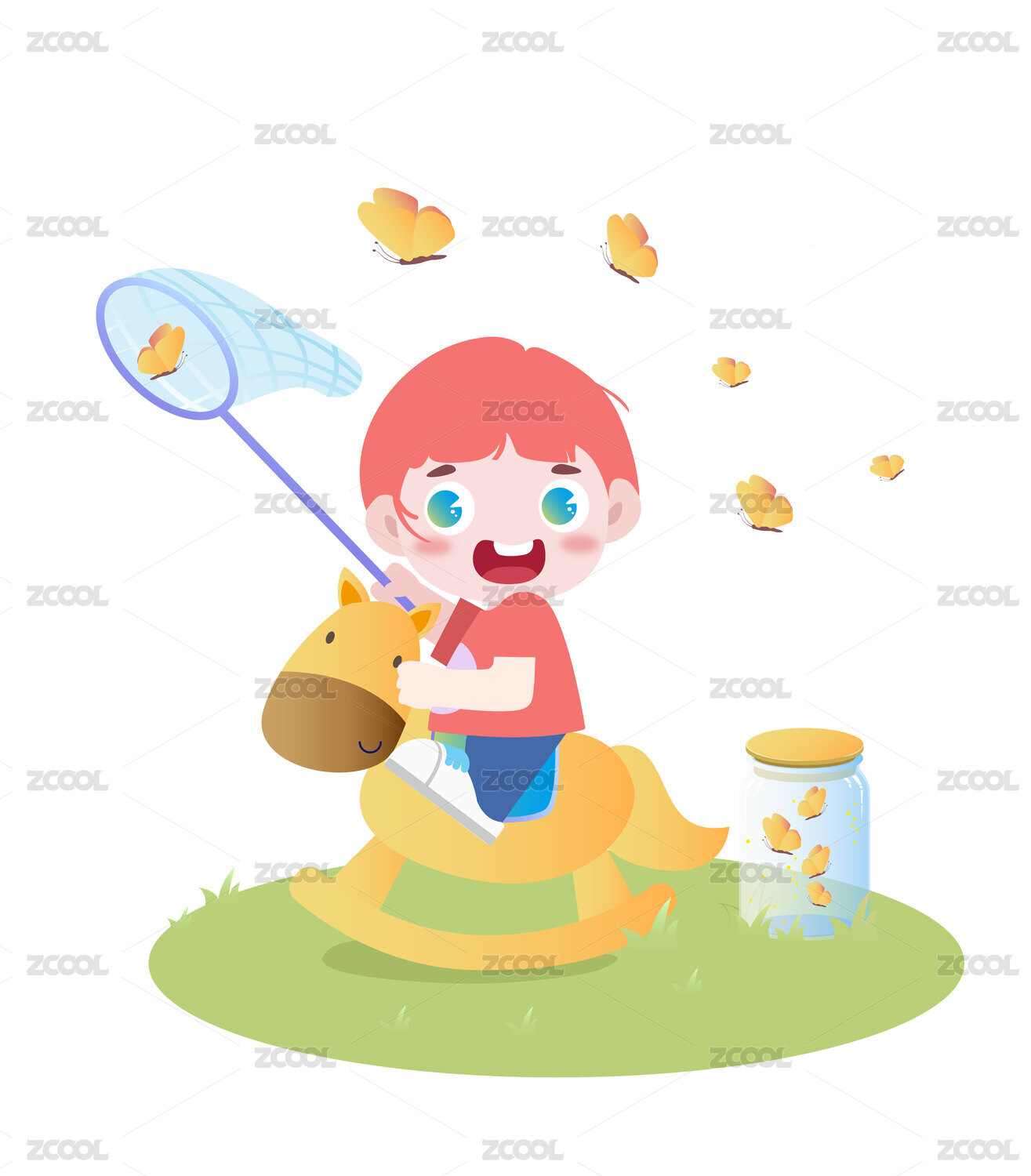 小男孩骑着木马拿着网扑蝴蝶