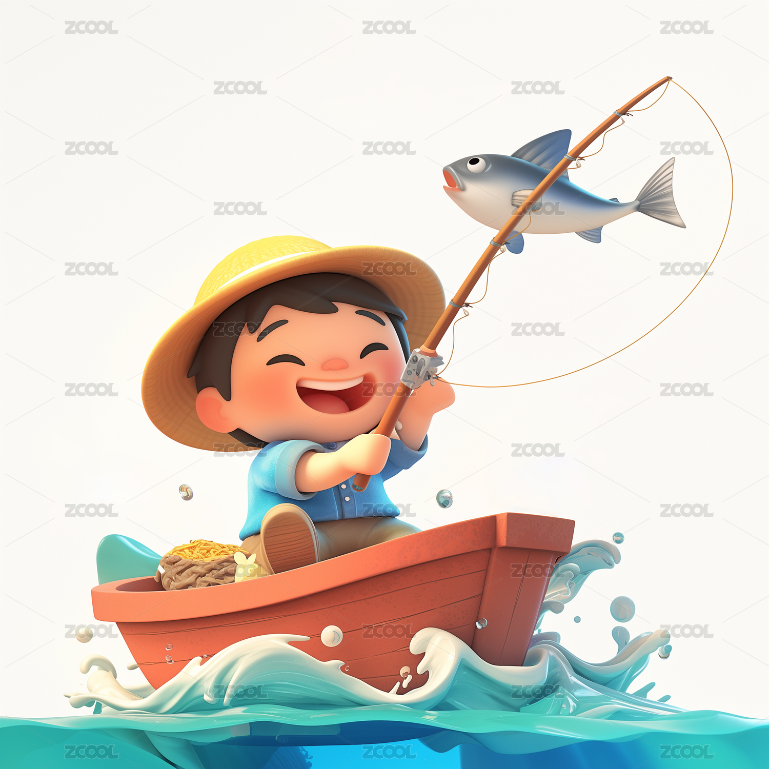 3D卡通男孩坐在木船上钓鱼