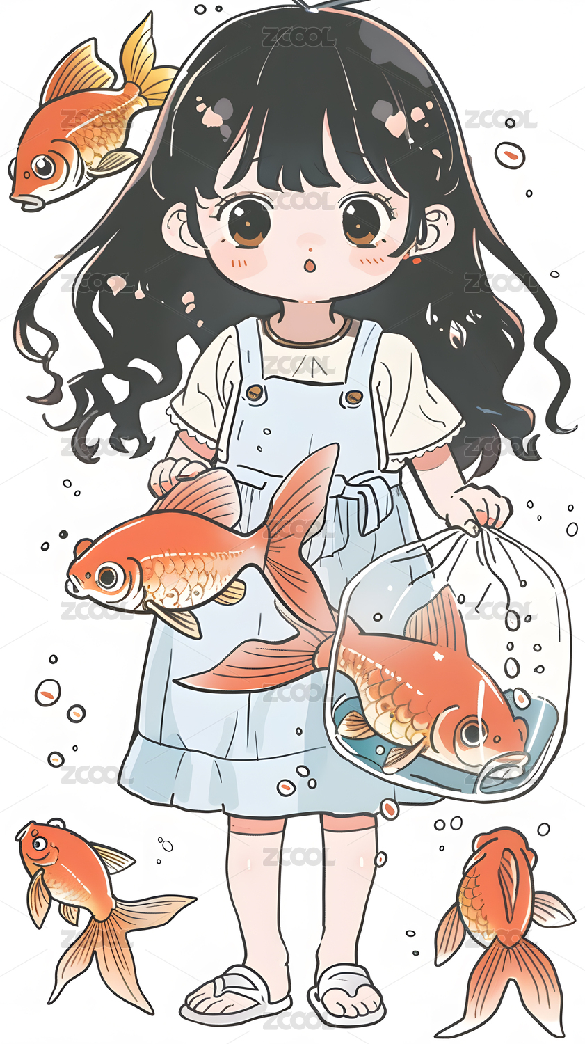 卡通女孩钓鱼插画