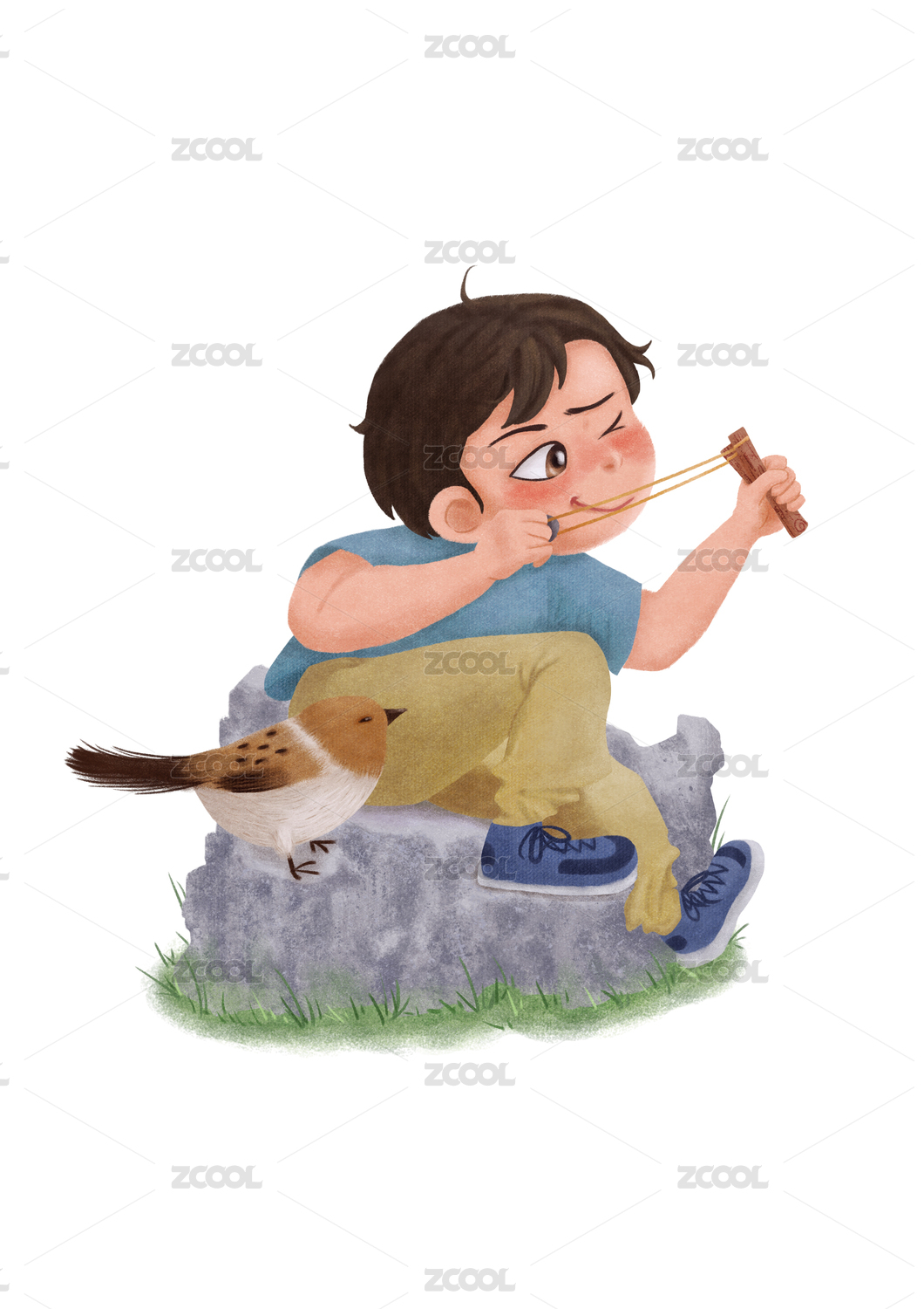 坐在石头上拉弹弓的调皮男孩和一只小麻雀