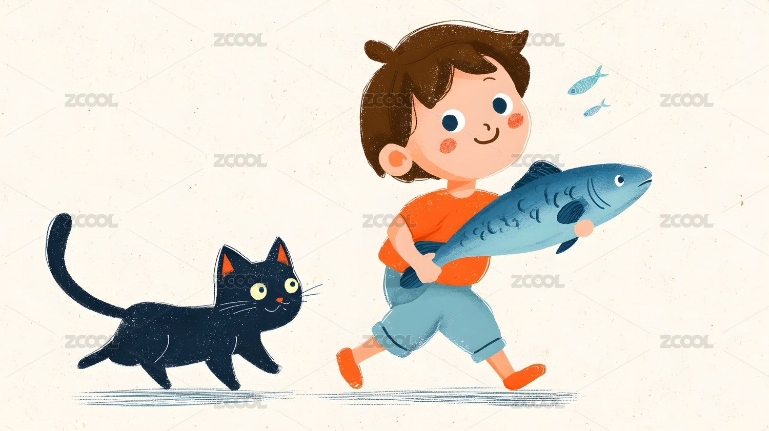 手绘风格男孩抱鱼与黑猫互动童趣插画