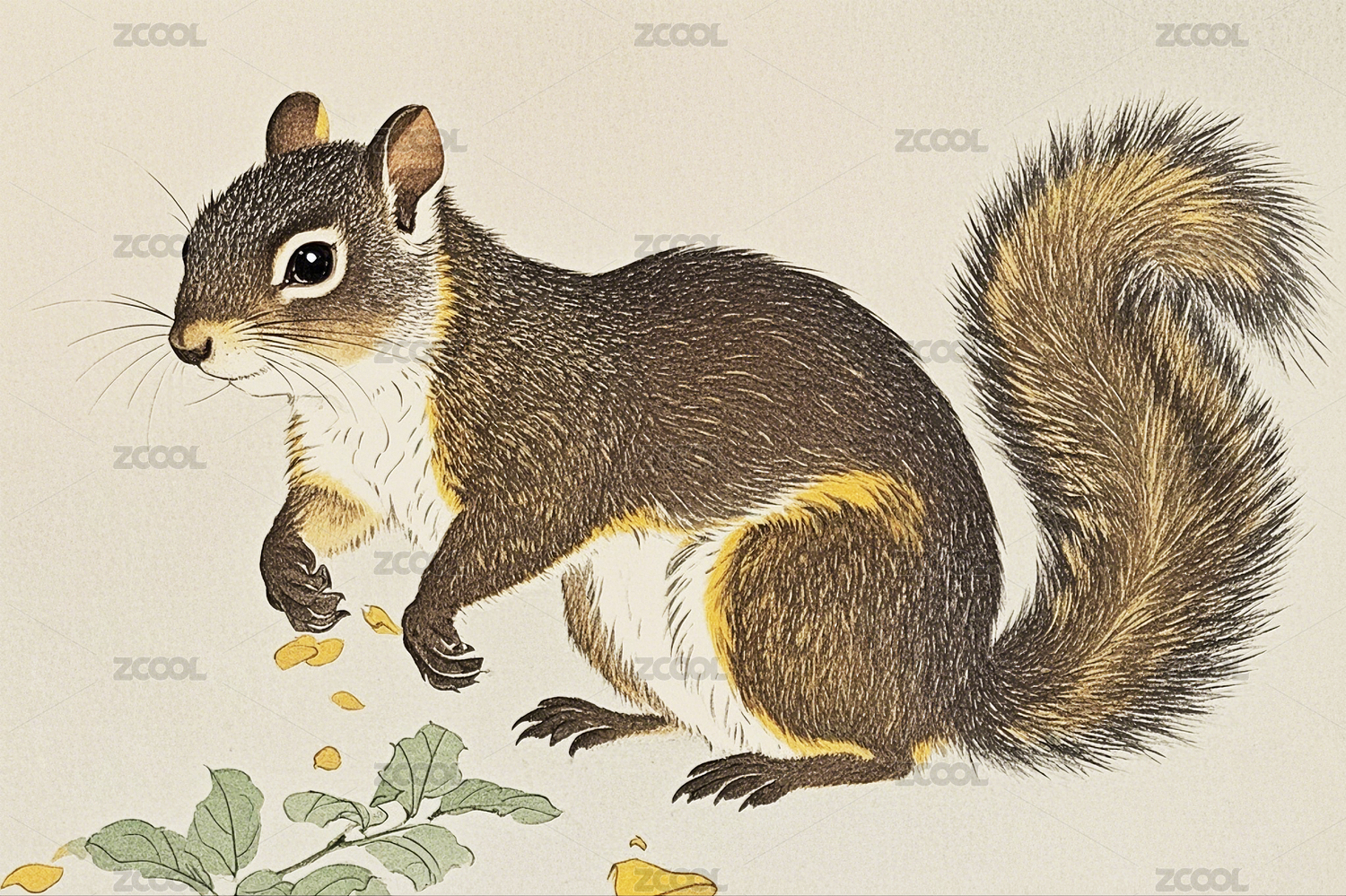 一只毛茸茸的复古版画风格的松鼠插画