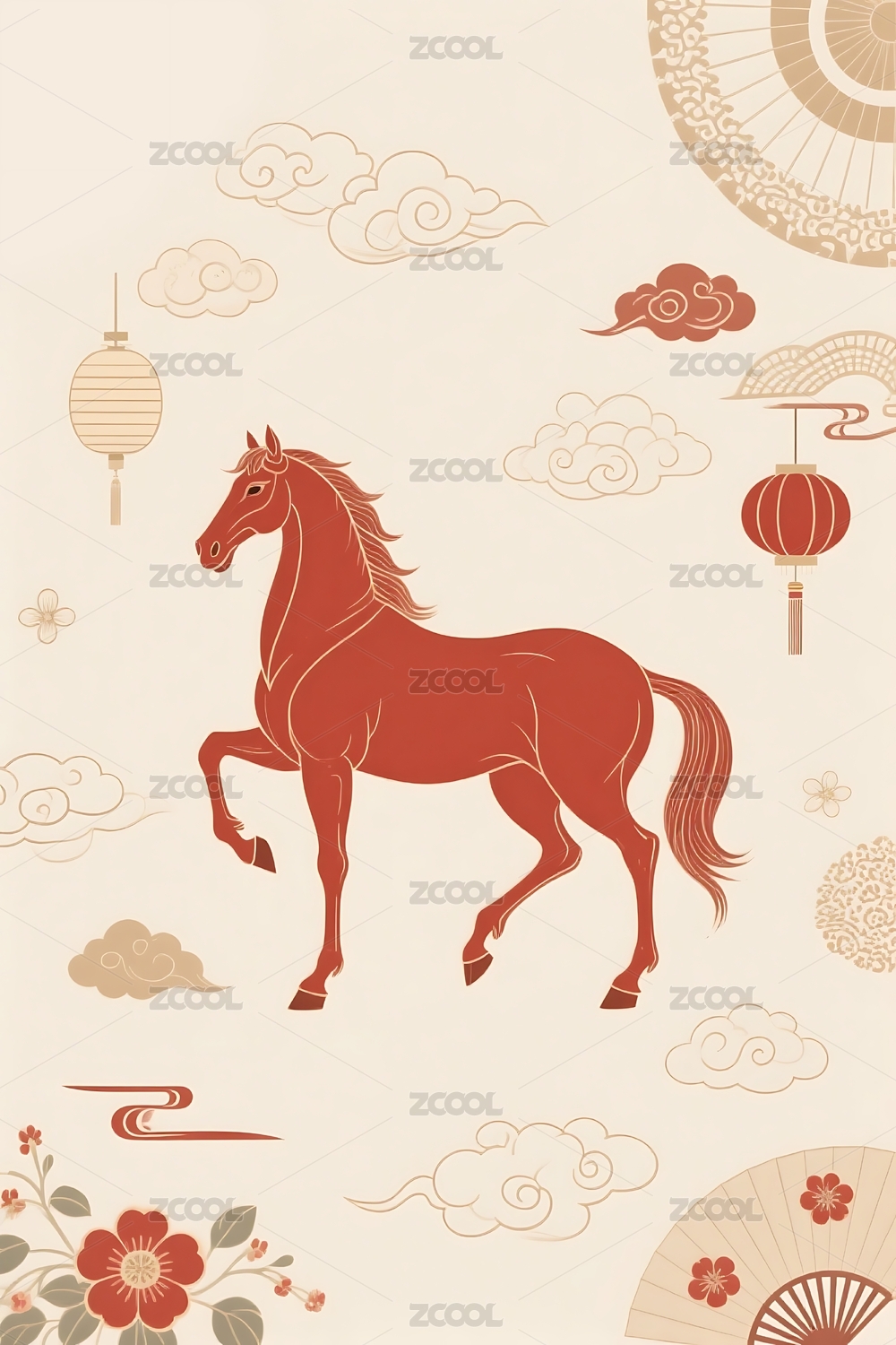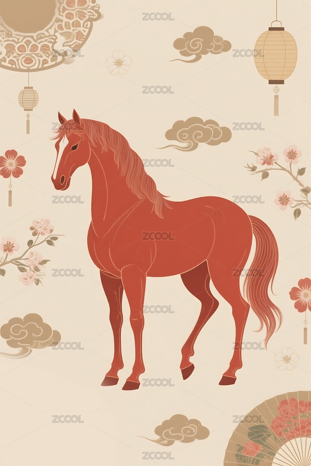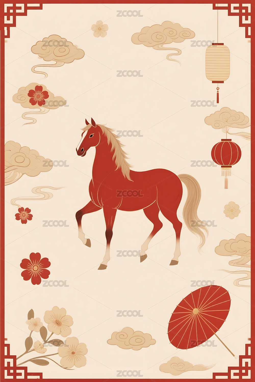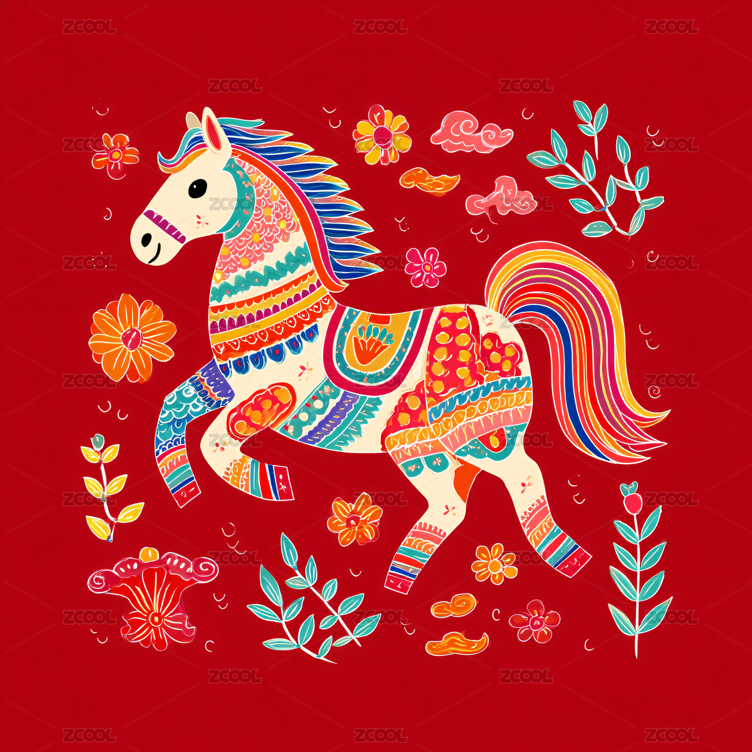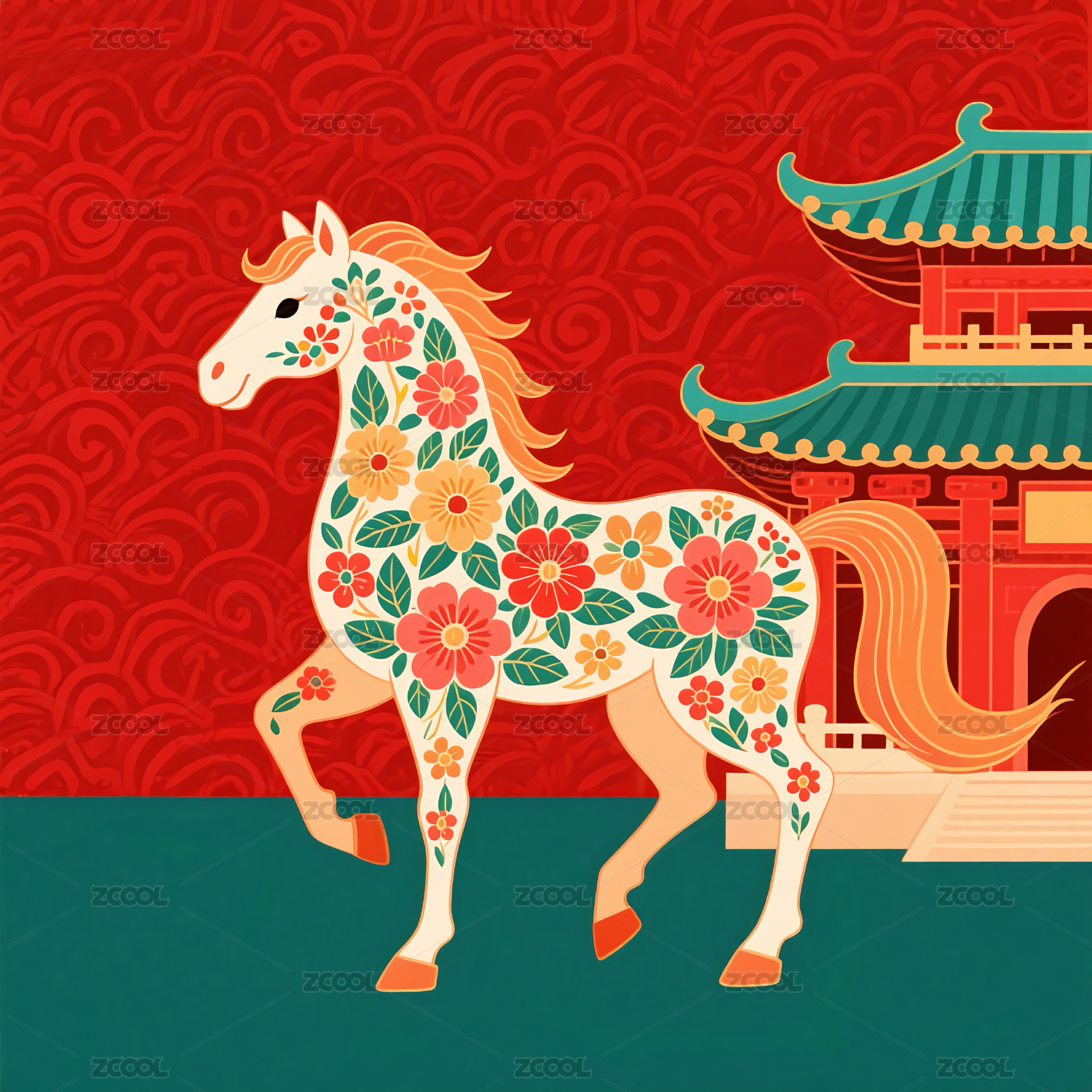 红色骏马与传统元素插画