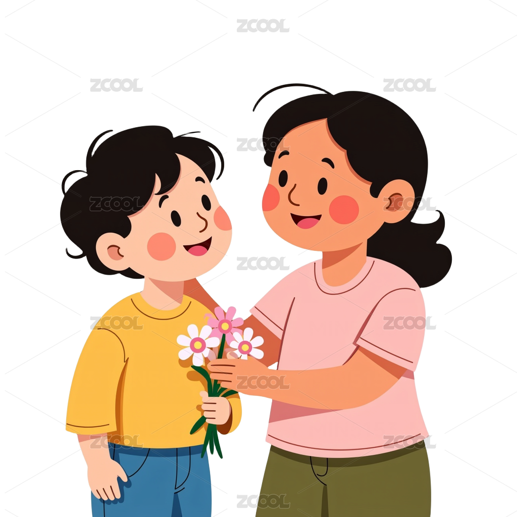 手绘矢量插画 女儿给妈妈送康乃馨 母亲节