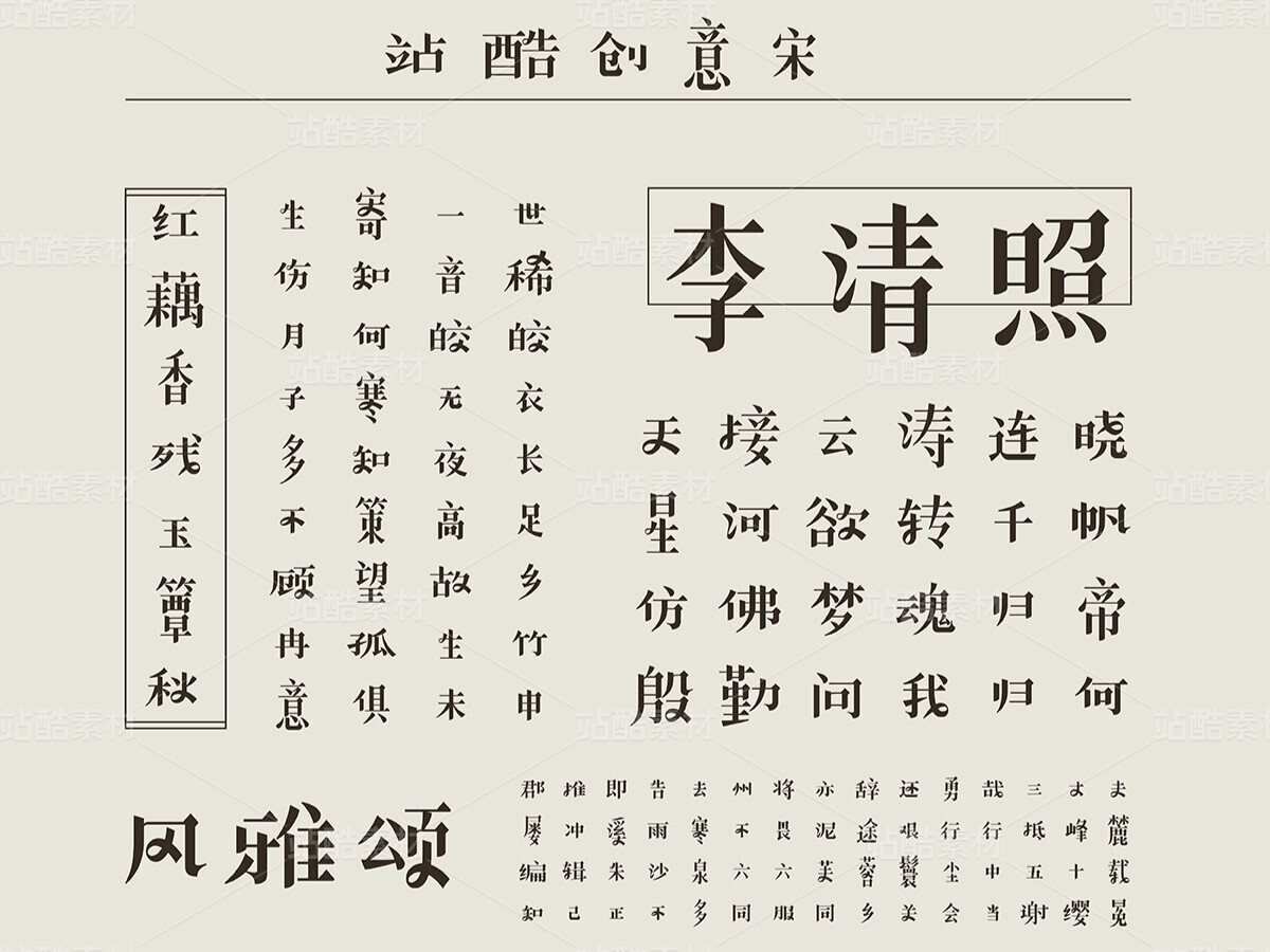 站酷创意宋,这是一款别具一格的宋体字,在保留宋体字基本特质的前提下,对多处细节进行了创意变形与设计:撇捺、提勾等笔画之间的连笔设计,俏皮而灵动,增添了字体的亲近感;不同结构的字面变化,带来了鲜明的节奏感,活泼有趣,错落有致……正是这样的风格创新,让这款字体在设计应用上也拥有了更多的可能性,在品牌形象、海报招贴、产品包装等方面,这款字体,都会带来优质而独特的展示效果。