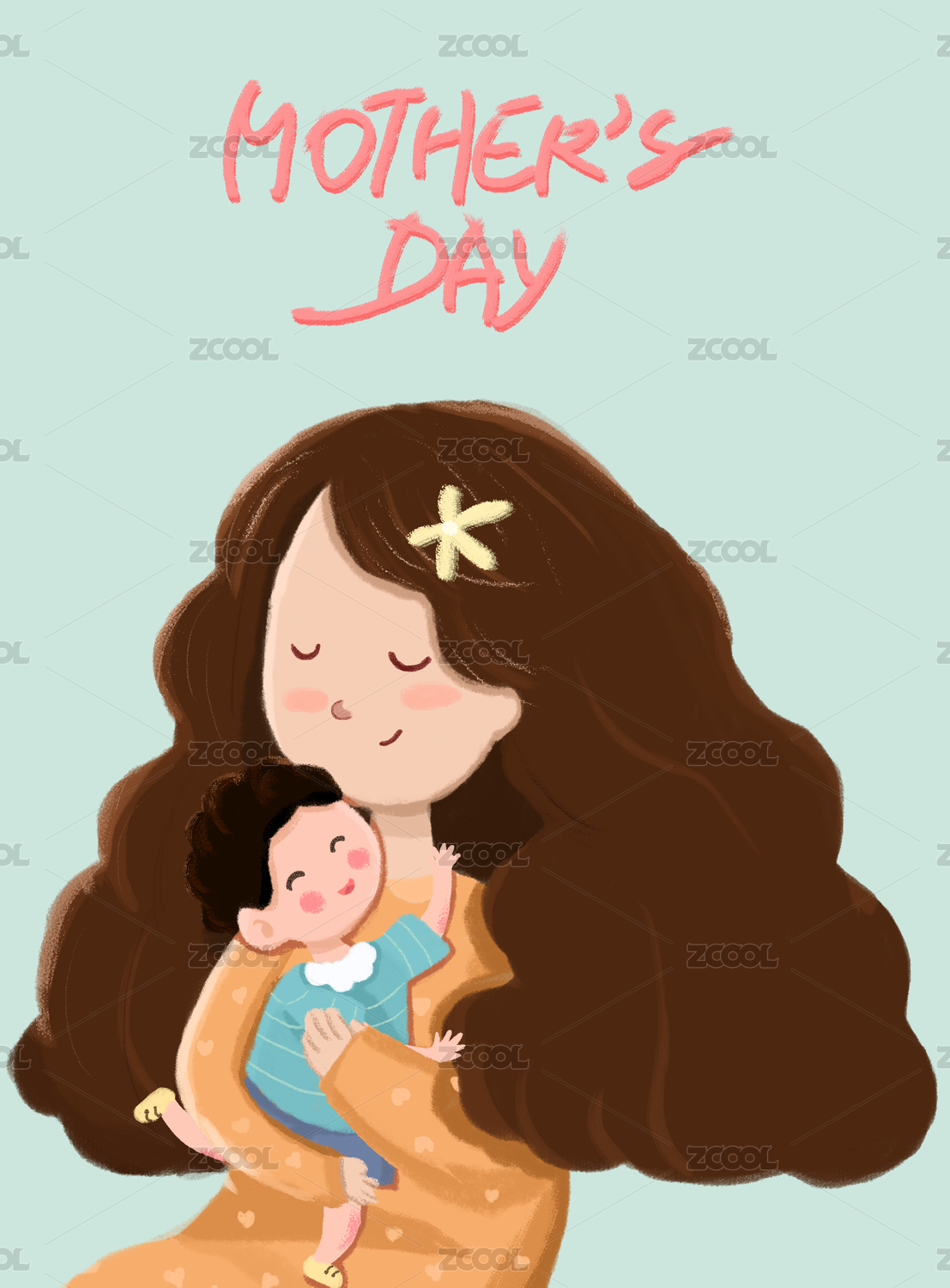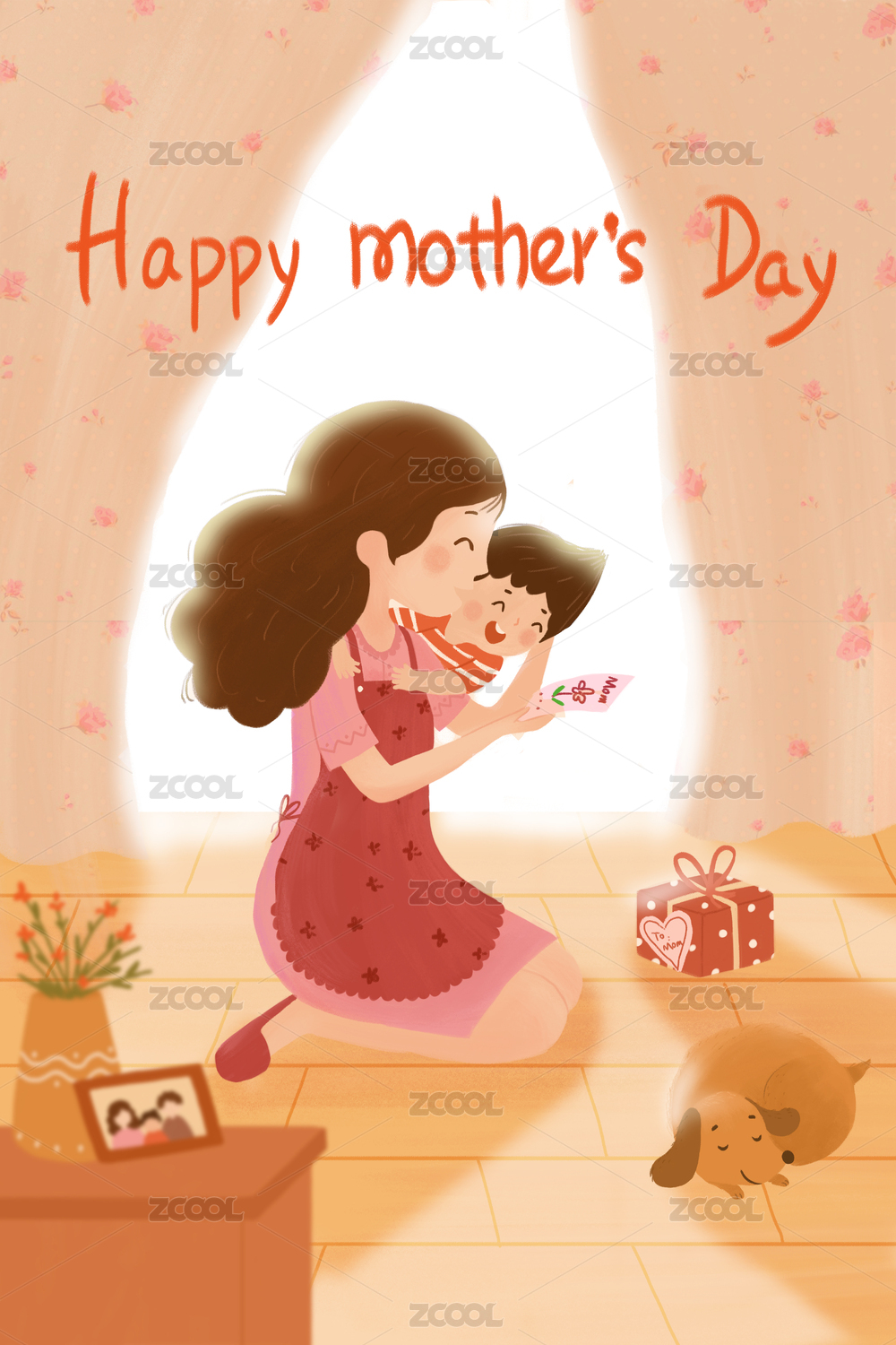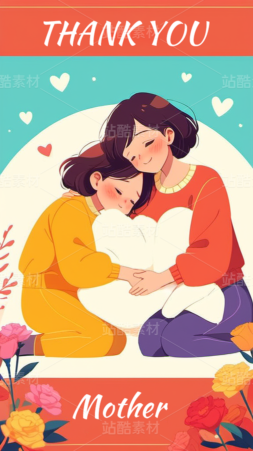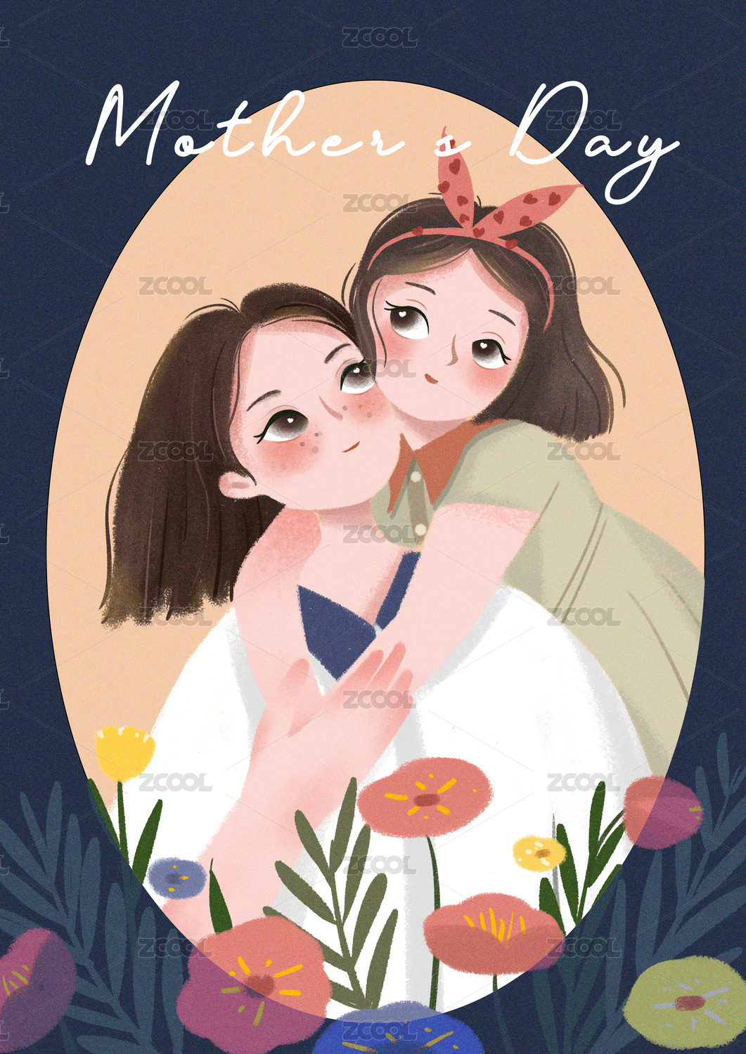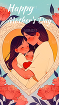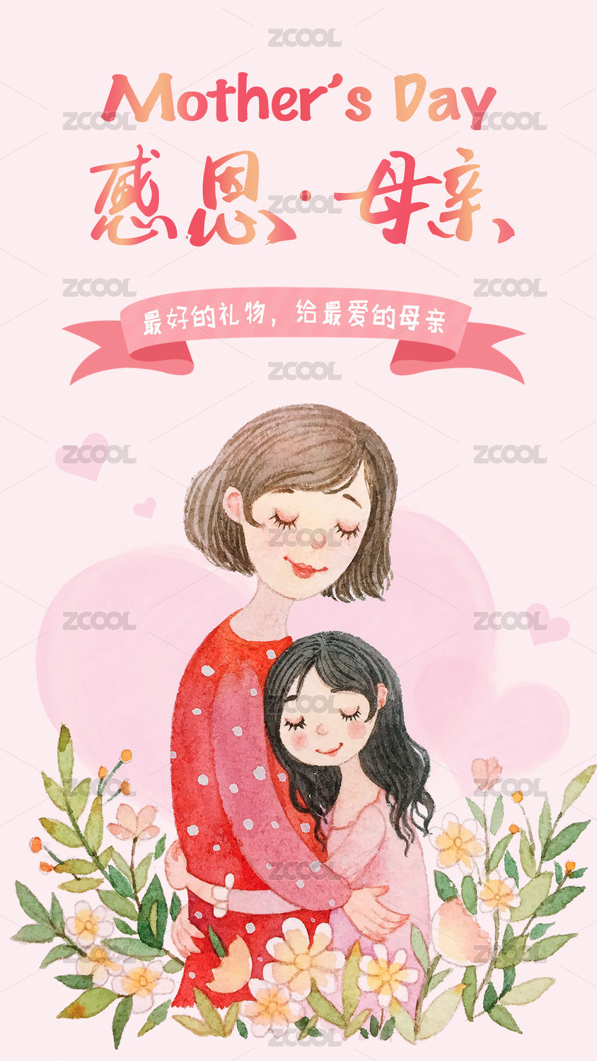 母亲节插画,粉色爱心背景下妈妈拥抱女儿