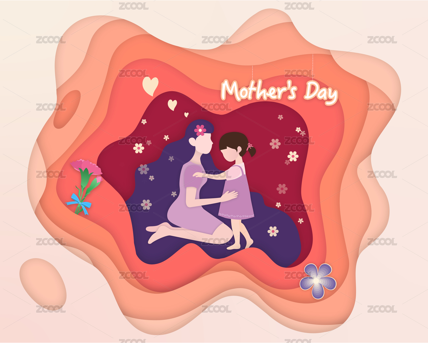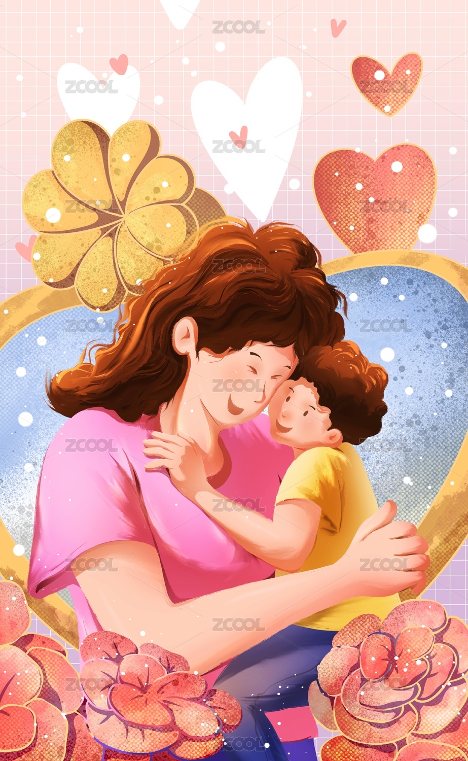 母亲节插画,粉色爱心背景下妈妈拥抱女儿