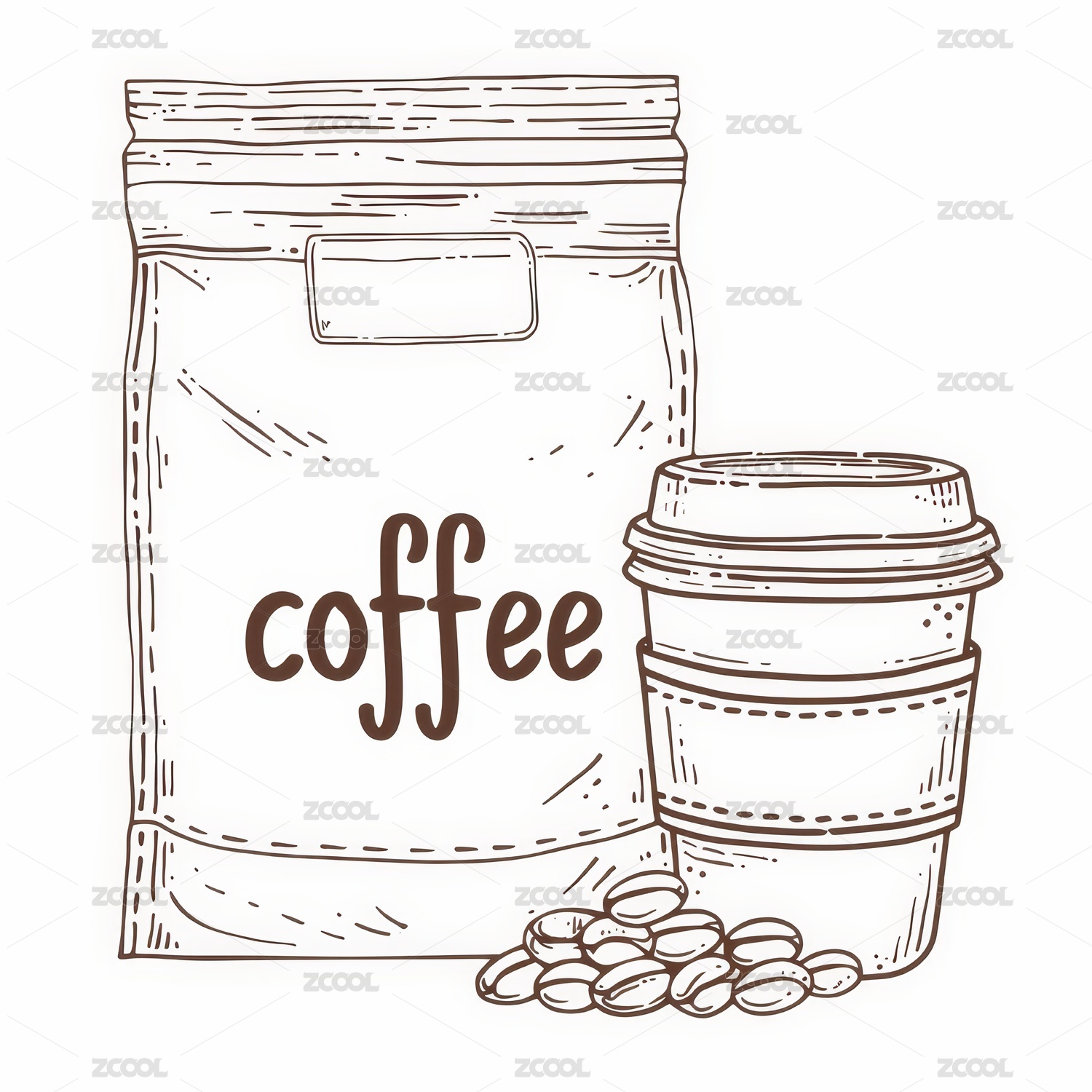 手绘咖啡袋与咖啡杯组合