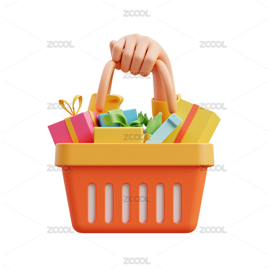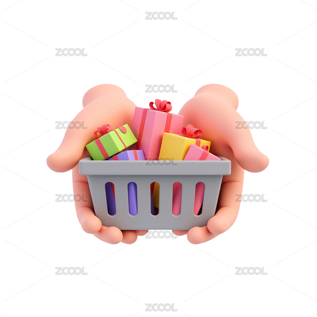 3D渲染的装着礼盒购物袋的购物篮电商插画