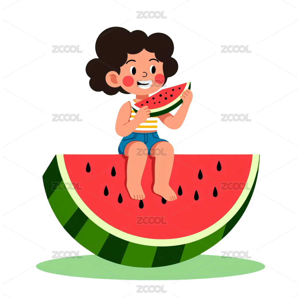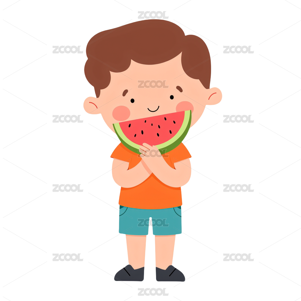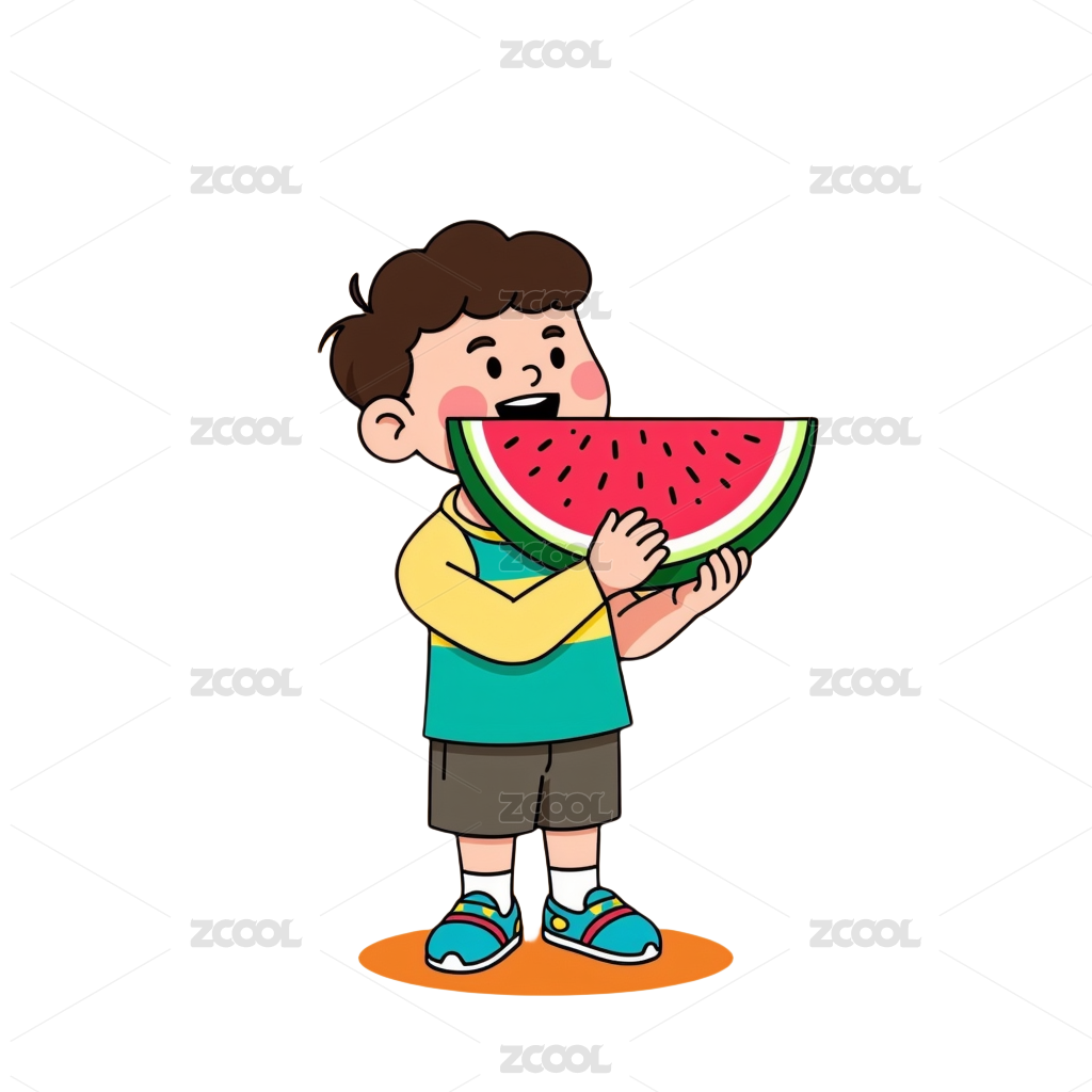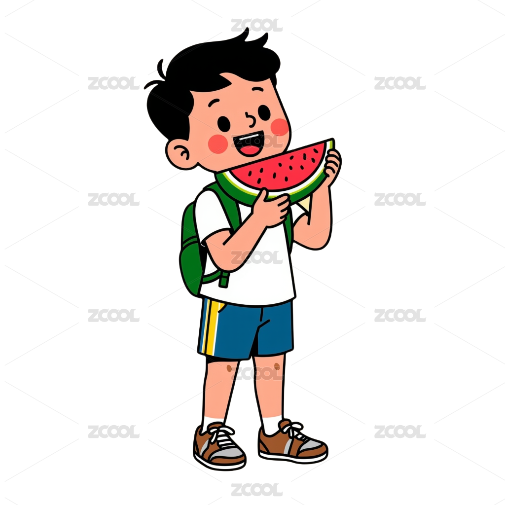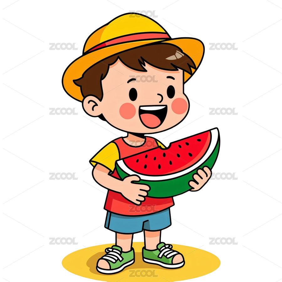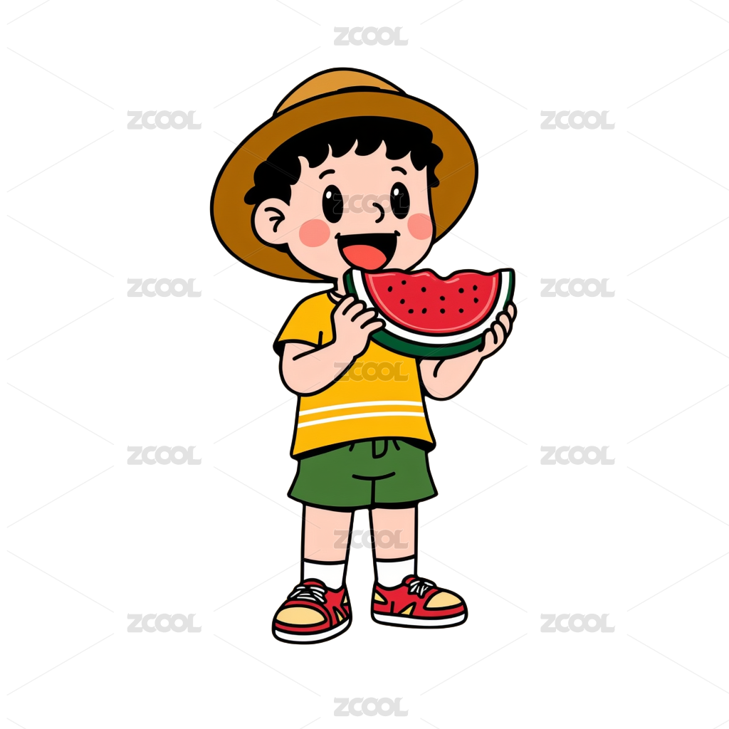 坐在草地上背考西瓜头戴草帽的吃瓜男孩