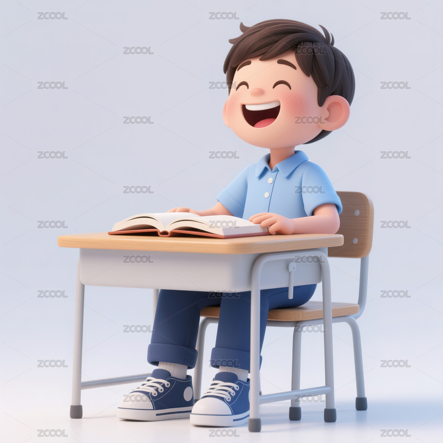 一个坐在课桌前思考的男生3d插画