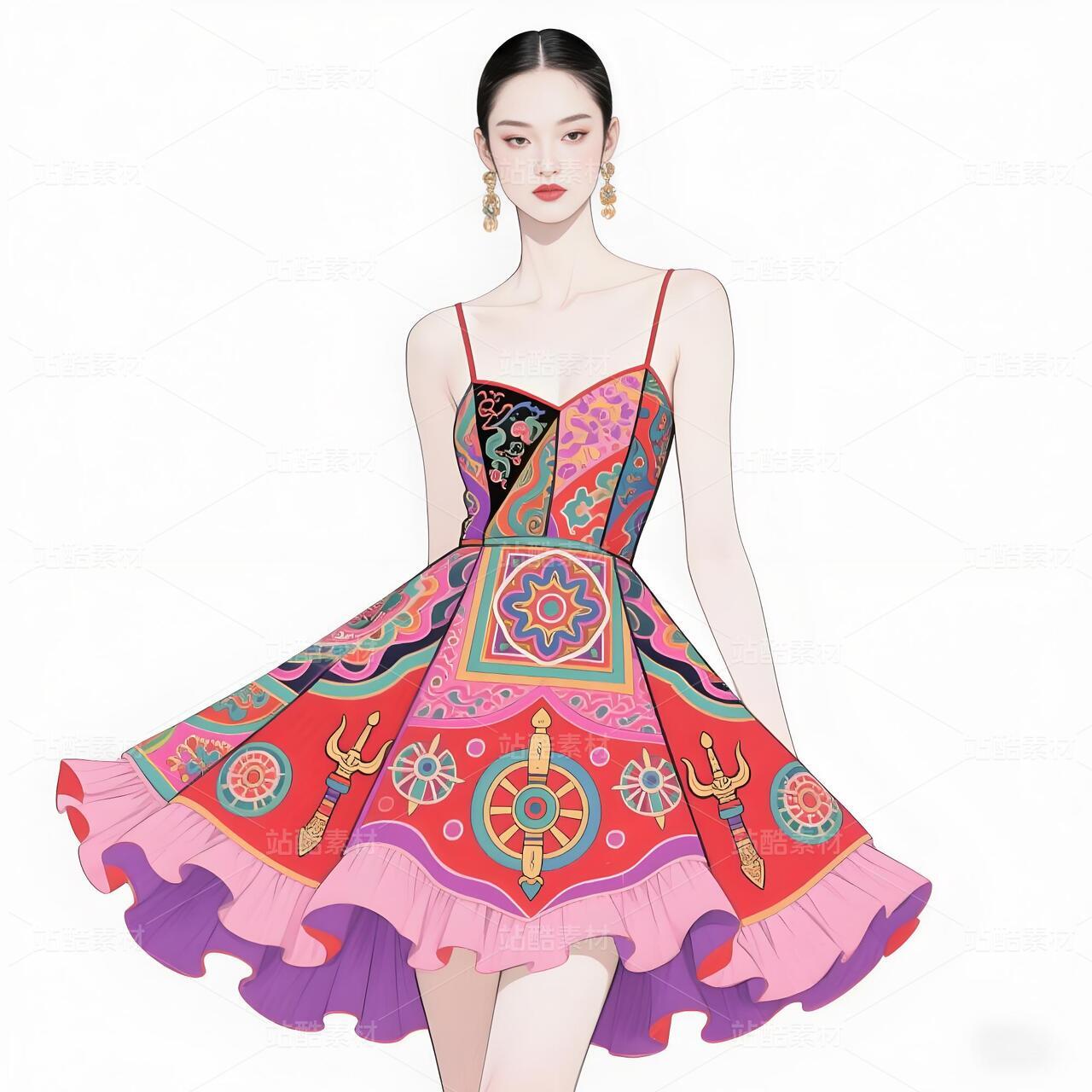 敦煌藻井纹样高定礼服设计手稿以"千年绮华"为灵感原点,将石窟藻井的几何秩序与宗教美学凝练为现代奢华的视觉语言。设计师以0.1mm针管笔勾勒出精准的线稿架构,在平裁与立裁结合的版型中植入藻井特有的同心方胜纹骨架,通过分层渐变的立体剪裁,令礼服廓形如藻井穹顶般向上聚拢延伸。