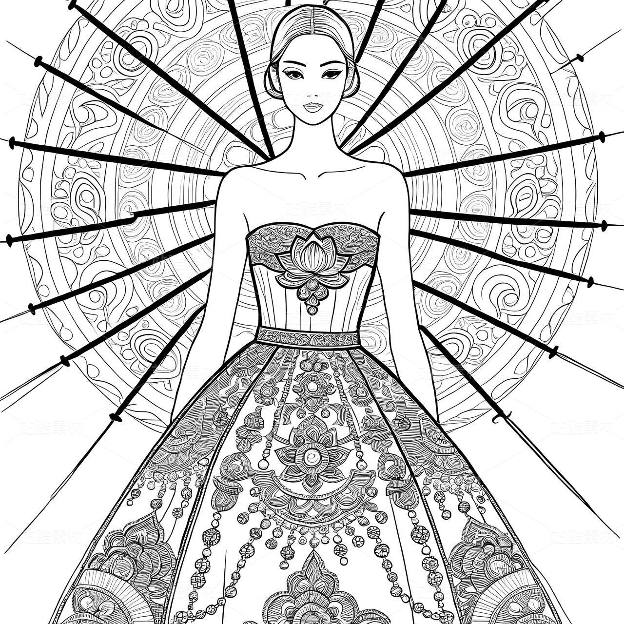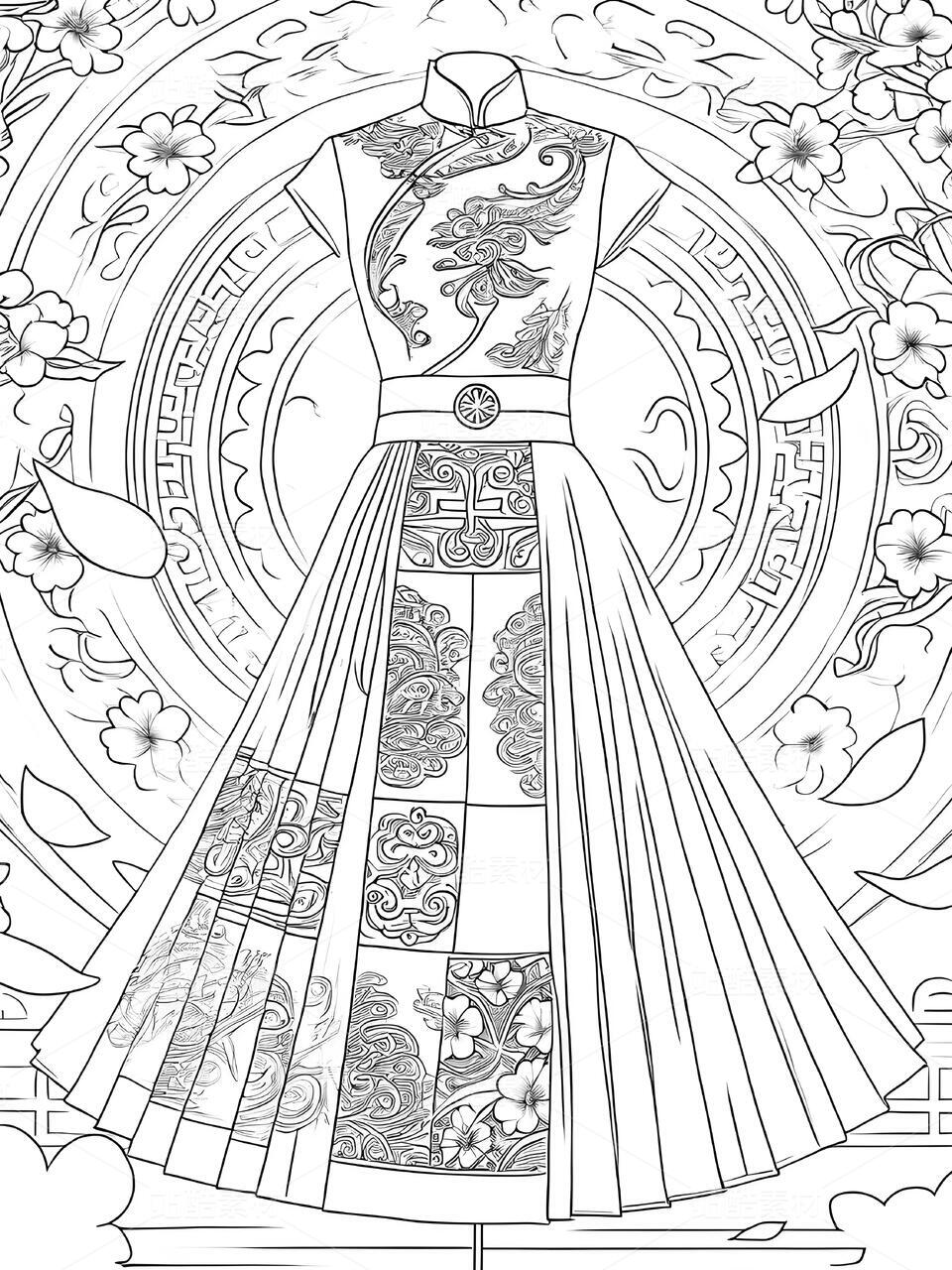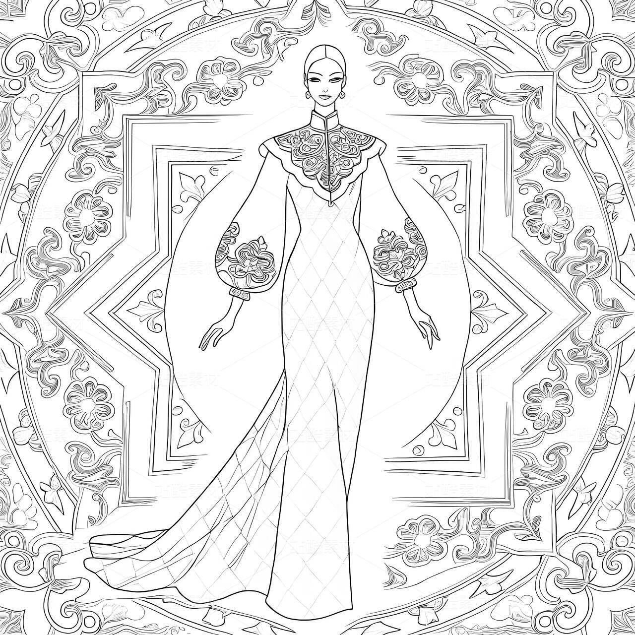 敦煌藻井纹样高定礼服设计手稿以当代视角重构壁画艺术的神性美学。设计师将藻井的“天圆九重”宇宙观化为立体剪裁——上半身以青金石色真丝提花面料构筑层叠方井框架,金丝刺绣的菱格纹暗藏莫高窟星宿图,领口垂落的不对称飘带提取藻井垂幔纹样,通过渐变朱砂色薄纱与银线勾边的卷草纹,模拟千年风沙侵蚀的斑驳质感。裙摆则打破传统对称结构,将中心莲花纹解构为八片放射状褶裥,每片褶裥以数码印花还原不同朝代的壁画色谱:北魏的土红、隋唐的石青、西夏的沙金在真丝欧根纱上交叠晕染,边缘缀以激光切割的忍冬纹蕾丝,仿佛藻井剥落的时光碎片。