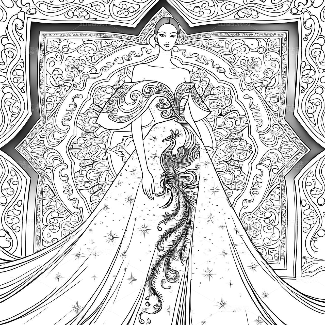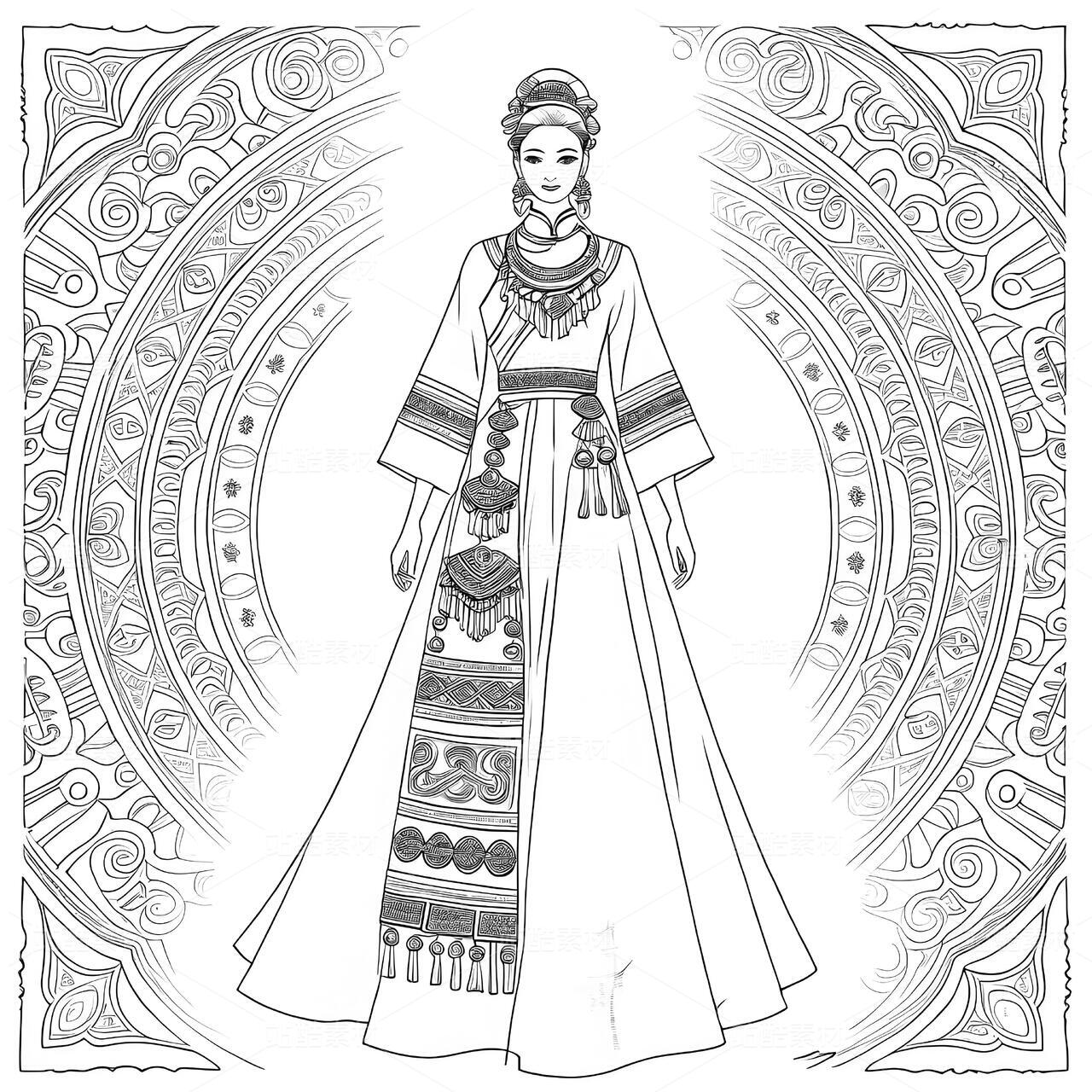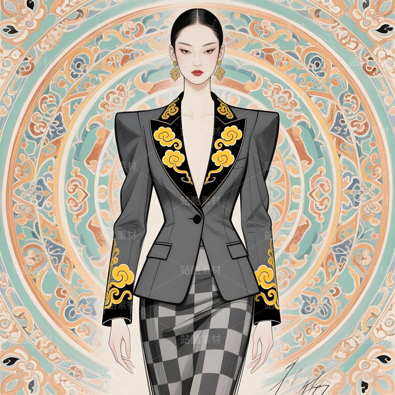 敦煌藻井纹样高定礼服设计手稿以当代视角重构壁画艺术的神性美学。设计师将藻井的“天圆九重”宇宙观化为立体剪裁——上半身以青金石色真丝提花面料构筑层叠方井框架,金丝刺绣的菱格纹暗藏莫高窟星宿图,领口垂落的不对称飘带提取藻井垂幔纹样,通过渐变朱砂色薄纱与银线勾边的卷草纹,模拟千年风沙侵蚀的斑驳质感。裙摆则打破传统对称结构,将中心莲花纹解构为八片放射状褶裥,每片褶裥以数码印花还原不同朝代的壁画色谱:北魏的土红、隋唐的石青、西夏的沙金在真丝欧根纱上交叠晕染,边缘缀以激光切割的忍冬纹蕾丝,仿佛藻井剥落的时光碎片。