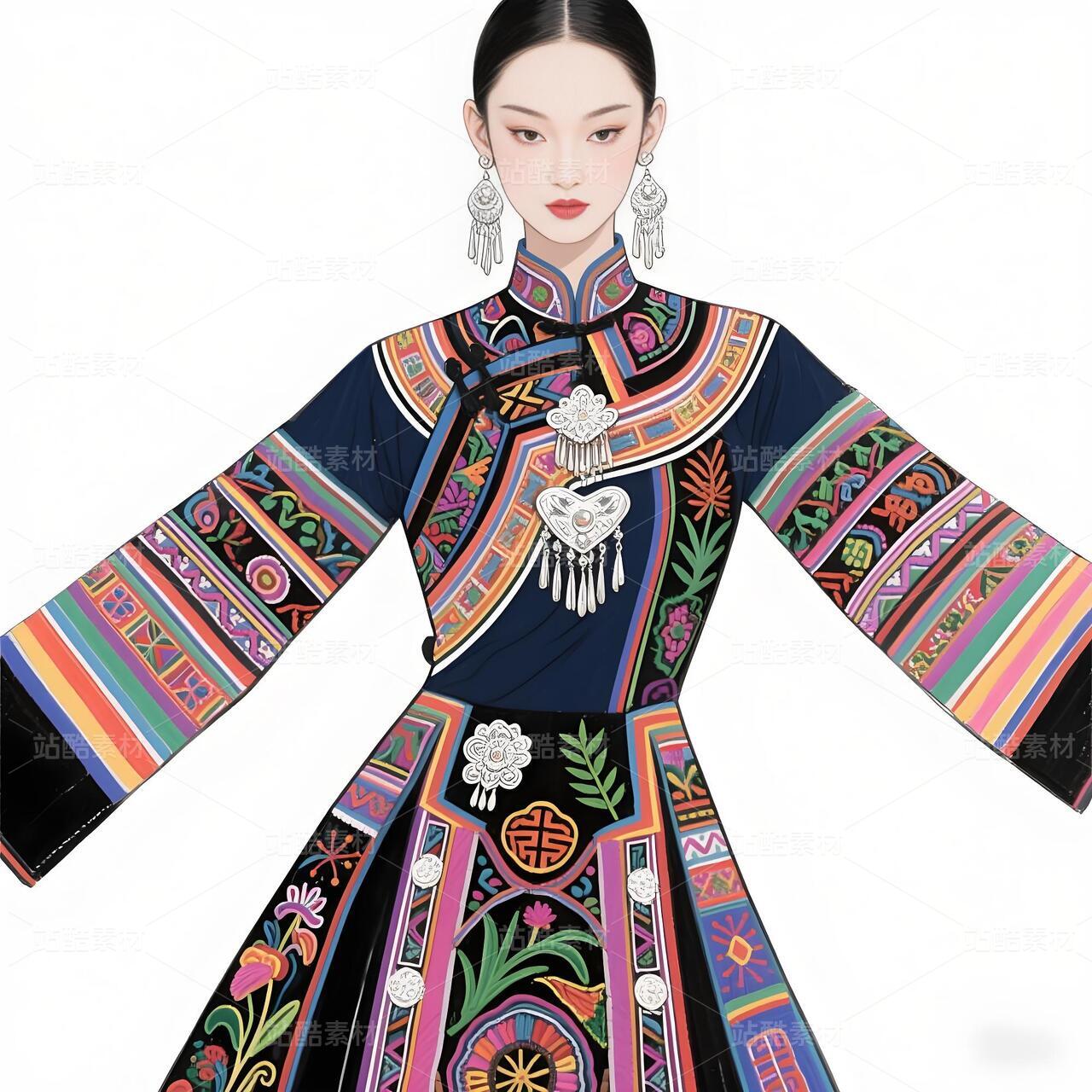 高定苗族蜡染礼服设计手稿正面图,礼服带有苗族特色元素和苗族银饰,以白色背景凸显设计。